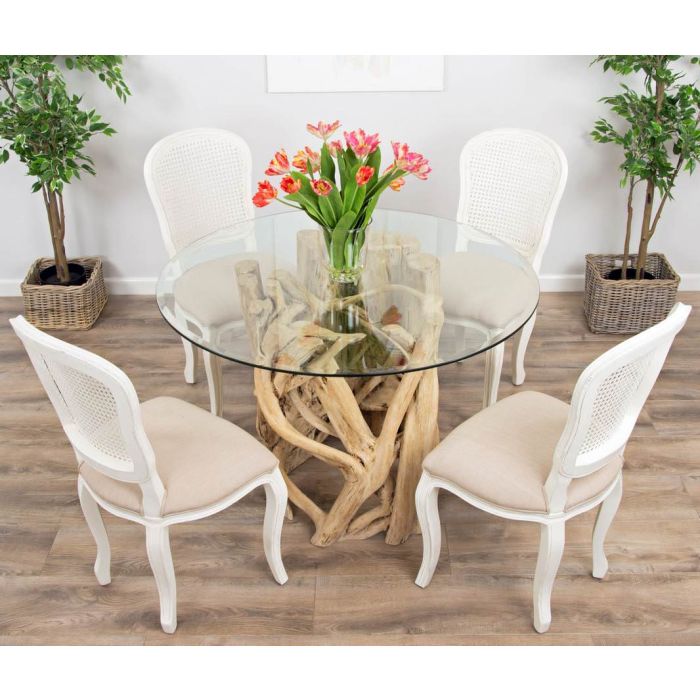 Our shabby chic Java root dining tables are contemporary and modern which will keep you on trend as they roll with the times! The Java roots we stock are similar to that found on BBC's Saturday Kitchen television show, which have become a popular favourite amongst our customers as they offer a unique edge to your dining experience. The twists, turns and intricate detailing of each root adds an immense amount of character to these dining tables and being able to choose which root suits you best adds to the luxury of these fabulous centerpieces. Although the Java roots have a hollow centre this does not take away from their sturdy nature and they can hold our toughened safety glass with ease! The root bases are completely natural and have been excavated out of the ground from The National Indonesian Eco Programme which encourages regrowth of forests and promotes sustainable livelihoods for local people. The 1.2m Java root dining table will comfortably seat 4-6 people where we have paired it with our tasteful and opulent Murano dining chairs which have perfectly carved legs, supportive curved rattan back and sumptuous seat cushion to add maximum comfort and support. Â