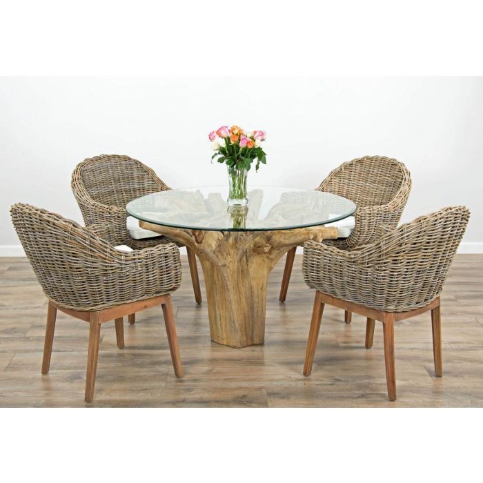 Our ergonomic and intricate flute style teak root dining tables are a must have to complete your dining space, they have been hand crafted from one solid piece of root that has been excavated out of the ground from The National Indonesian Eco Programme which encourages regrowth of forests and promotes sustainable livelihoods for local people. The 1.2m Flute will make a solid and strong centerpiece which definitely creates a great topic of conversation, our customers also like to add statement lighting to further enhance the beauty of these tables. The flute style is also one of our most popular dining roots which can seat 4 to 6 people comfortably and we have paired this dining table with our Kubu Wicker Scandi Armchairs which will keep you on trend with their stylish curved shaped that hugs you around the waist for maximum comfort and support. The contrast between the lightly coloured timber legs and wicker gives a very earthy and natural feel to these stunning chairs which compliments the root dining table well, we are positive once you have bought this dining table with these chairs you will never need another dining set again! The glass we use is toughened safety glass that is 10mm thick with beveled edges, which makes this glass top extremely heavy. It simply rests on top of the root and is supported very safely by the structure of the root base underneath. To find our more about our glass cleaner click here. To keep your table in top condition, use our Briwax natural beeswax. With a clear finish, it can be applied to any surface quickly and easily to clean, polish and protect your wooden furniture against stains and scratches. Suitable for our Reclaimed teak, elm, pine, alba or oak furniture Briwax is the ultimate in universal furniture protection for raw untreated wood. Click Here to find our more.   Measurements - Root - Height 76cm - Measurements may vary Glass Size - 1.2m Circular Chairs - Total - Width 60cm x Depth 58cm x Height 90cm            - Seat - Width 42cm x Depth 42cm x Height 52cm (Including Cushion)            - Backrest - Height 48cm            - Armrest - Height 72cm   Please Note - Delivery charges may apply when ordering a root dining table as they are very heavy, please call us on 01726 884123 to get the best delivery quote available. Email us at [email protected] with your requirements and we can send you some photographs of the roots we have in stock.