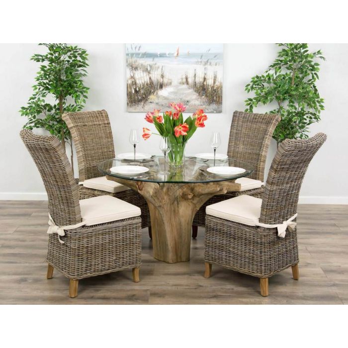 Our ergonomic and intricate flute style teak root dining tables are a must have to complete your dining space, they have been hand crafted from one solid piece of root that has been excavated out of the ground from The National Indonesian Eco Programme which encourages regrowth of forests and promotes sustainable livelihoods for local people. The 1.2m Flute will make a solid and strong centerpiece which definitely creates a great topic of conversation, our customers also like to add statement lighting to further enhance the beauty of these tables. The flute style is also one of our most popular dining roots which can seat 4 to 6 people comfortably, our Latifa chairs are the perfect match to this root dining table and complete this sets overall look. The Latifa chairs are extremely robust and stable but their sturdy nature does not take away from their elegant appearance with its stylish high backs and comfortable feather like cushions that tie neatly around the back of the chair. We are positive that once you have bought a root dining table and Latifa chairs you will never need another table dining set! We advise hand washing the cushion covers in warm water and rinsing by hand, to remove any excess water spin cushion cover in washing machine. Finally add cover to cushion when damp. The glass we use is toughened safety glass that is 10mm thick with beveled edges, which makes this glass top extremely heavy. It simply rests on top of the root and is supported very safely by the structure of the root base underneath. To find our more about our glass cleaner click here. To keep your table in top condition, use our Briwax natural beeswax. With a clear finish, it can be applied to any surface quickly and easily to clean, polish and protect your wooden furniture against stains and scratches. Suitable for our Reclaimed teak, elm, pine, alba or oak furniture Briwax is the ultimate in universal furniture protection for raw untreated wood. Click Here to find our more.   Measurements - Root - Height 76cm - Measurements may vary Glass Size - 1.2m Circular Chairs - Width 50cm x Depth 60cm x Back Height 108cm            -  Seat Width 50cm x Seat Depth 45cm x Seat Height 48cm   Please Note - Delivery charges may apply when ordering a root dining table as they are very heavy, please call us on 01726 884123 to get the best delivery quote available. Email us at [email protected] with your requirements and we can send you some photographs of the roots we have in stock.