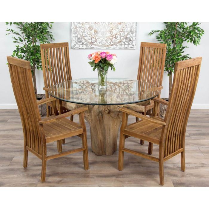 Our ergonomic and intricate flute style teak root dining tables are a must have to complete your dining space, they have been hand crafted from one solid piece of root that has been excavated out of the ground from The National Indonesian Eco Programme which encourages regrowth of forests and promotes sustainable livelihoods for local people. The 1.2m Flute will make a solid and strong centerpiece which definitely creates a great topic of conversation, our customers also like to add statement lighting to further enhance the beauty of these tables. The flute style is also one of our most popular dining roots which can seat 4 to 6 people comfortably our Vikka armchairs are the perfect accessory to match this table as they have a good strong bracing between the legs which offers durability and support. The skirt at the back helps to create an even taller and elegant appeal, we are positive once you have bought a root dining table with these chairs you will never need another dining set! The glass we use is toughened safety glass that is 10mm thick with beveled edges, which makes this glass top extremely heavy. It simply rests on top of the root and is supported very safely by the structure of the root base underneath. To find our more about our glass cleaner click here. To keep your table in top condition, use our Briwax natural beeswax. With a clear finish, it can be applied to any surface quickly and easily to clean, polish and protect your wooden furniture against stains and scratches. Suitable for our Reclaimed teak, elm, pine, alba or oak furniture Briwax is the ultimate in universal furniture protection for raw untreated wood. Click Here to find our more.   Measurements - Root - Height 76cm - Measurements may vary Glass Size - 1.2m Circular Chairs - Seat Width (Front) 56cm x Seat Width (Back) 46cm            - Seat Height 47cm x Arm Height 67cm x Back Height from Floor 116cm   Please Note - Delivery charges may apply when ordering a root dining table as they are very heavy, please call us on 01726 884123 to get the best delivery quote available. Email us at [email protected] with your requirements and we can send you some photographs of the roots we have in stock.