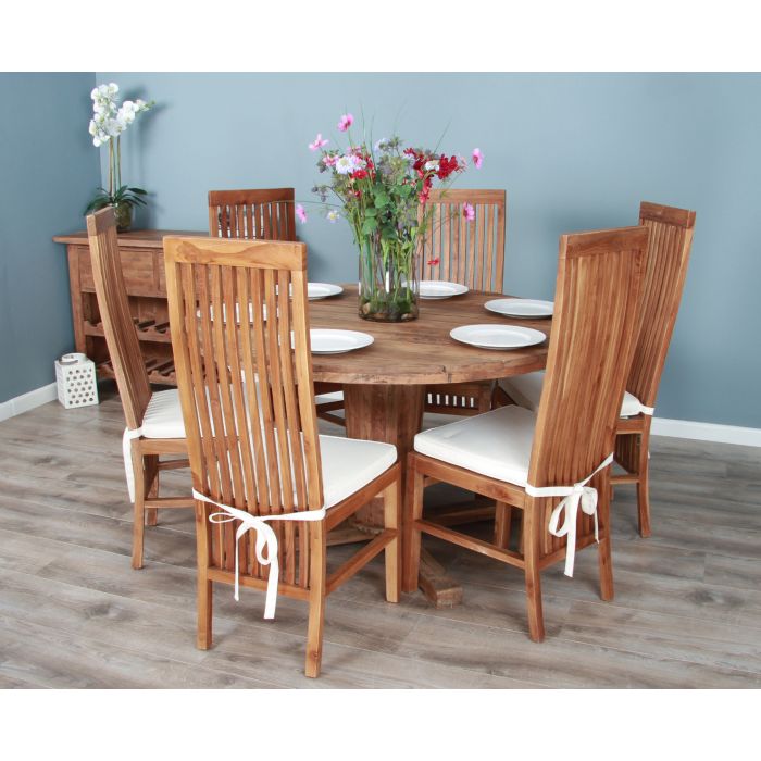 Save space and make a statement with our appropriately named Character dining table, this circular table can slot into your daily routine to comfortably seat 4-6 people. The beautifully crafted Reclaimed Teak tabletop has a rustic open slatted design made up from individual slats, that sits upon a barrel-style pedestal base. The Character tables appearance is effortless and completely timeless with a natural fine wax finish, focusing on practicality with its minimal 'X' leg platform, making this table a great conversation piece. Paired with our tall and rustic Vikka dining chairs, create a formal dining area that gives a grand appearance. The Vikka chairs have a good strong bracing between the legs, giving the chair its sturdy finish. Can be paired with our comfortable cushions available in two colours, that tie neatly around the back of the chair.