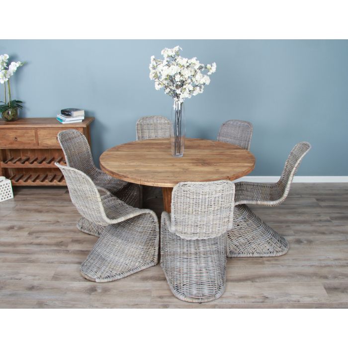 Save space and make a statement with our appropriately named Character dining table, this circular table can slot into your daily routine to comfortably seat 4-6 people. The beautifully crafted Reclaimed Teak tabletop has a rustic open slatted design made up from individual slats, that sits upon a barrel-style pedestal base. The Character tables appearance is effortless and completely timeless with a natural fine wax finish, focusing on practicality with its minimal 'X' leg platform, making this table a great conversation piece. Accompanied by six of our natural wicker Zorro chairs to make a stunningly unique dining set. These beautiful and stylish, yet extremely strong, sustainable stacking chairs offer an unusual and space-saving alternative. With its strong coated metal frame and elegant lines, it is the ideal Kubu wicker dining chair solution for any dining environment.