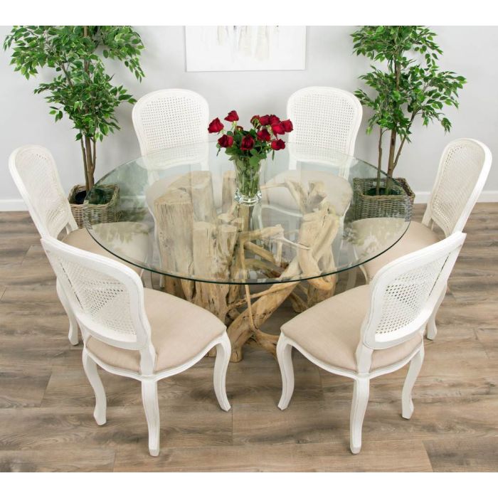 Our shabby chic Java root dining tables make an excellent conversation piece and will definitely impress your guests! The design of the Java roots are very modern, contemporary and are similar to that found on BBC's Saturday Kitchen television show which have become a popular favourite amongst our customers. The Java root will keep you on trend and this dining table offers a unique edge to your dining experience. The overall design of the Java root has very intricate detailing which is specific to each root and you will never find no two roots that look the same, the bases are completely natural and come in different shapes and sizes. Although the Java roots have a hollow centre this does not take away from their sturdy nature and they can hold our toughened safety glass with ease! The roots have been excavated out of the ground from The National Indonesian Eco Programme which encourages regrowth of forests and promotes sustainable livelihoods for local people. The 1.5m Java root dining table will comfortably seat 6 people with our gorgeously stylish Murano chairs which feature hand carved legs and a rattan back for ultimate support. The classic design of the Murano chair pairs well with the Java dining table as it will add to the retro shabby chic decor.