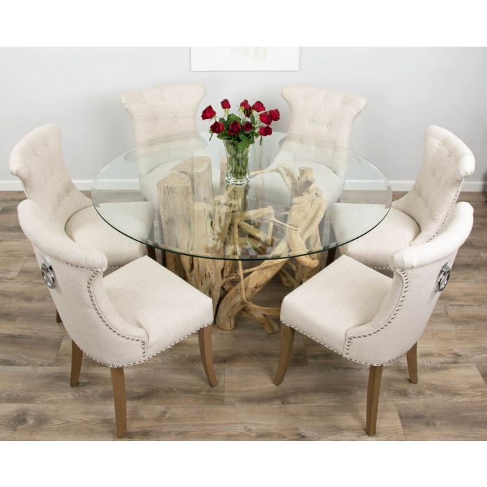 Our shabby chic Java root dining tables make an excellent conversation piece and will definitely impress your guests! The design of the Java roots are very modern, contemporary and are similar to that found on BBC's Saturday Kitchen television show which have become a popular favourite amongst our customers. The Java root will keep you on trend and this dining table offers a unique edge to your dining experience. The overall design of the Java root has very intricate detailing which is specific to each root and you will never find no two roots that look the same, the bases are completely natural and come in different shapes and sizes. Although the Java roots have a hollow centre this does not take away from their sturdy nature and they can hold our toughened safety glass with ease! The roots have been excavated out of the ground from The National Indonesian Eco Programme which encourages regrowth of forests and promotes sustainable livelihoods for local people. The 1.5m Java root dining table will comfortably seat 6 people with our Natural Windsor Ring Back dining chairs and will add a luxurious and sophisticated atmosphere to your dining area with it's finely tailored pleat design and deep buttoning detailing. The perfectly placed chrome upholstered tacks and metal ring pull works seamlessly with the bright and breezy natural coloured fabric, the vintage styling also makes the overall design stand out from the rest.Â