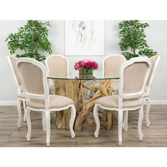 Our shabby chic Java root dining tables make an excellent conversation piece and will definitely impress your guests! The design of the Java roots are very modern, contemporary and are similar to that found on BBC's Saturday Kitchen television show which have become a popular favourite amongst our customers. The Java root will keep you on trend and this dining table offers a unique edge to your dining experience. The overall design of the Java root has very intricate detailing which is specific to each root and you will never find no two roots that look the same, the bases are completely natural and come in different shapes and sizes. Although the Java roots have a hollow centre this does not take away from their sturdy nature and they can hold our toughened safety glass with ease! The roots have been excavated out of the ground from The National Indonesian Eco Programme which encourages regrowth of forests and promotes sustainable livelihoods for local people. The 1.5m Java root dining table will comfortably seat 6 people with our lovely Paloma French style dining chairs that feature a gorgeous cream upholstered cushion on both the seat and the back rest to offer comfort and support. The delicate carved detailing adds an elegant and luxurious feel any shabby chic dining area.