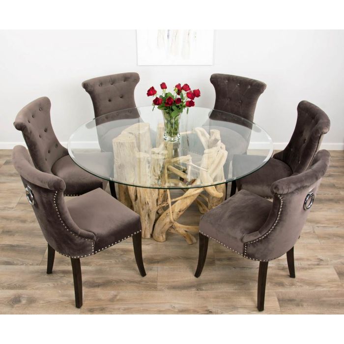 Our shabby chic Java root dining tables make an excellent conversation piece and will definitely impress your guests! The design of the Java roots are very modern, contemporary and are similar to that found on BBC's Saturday Kitchen television show which have become a popular favourite amongst our customers. The Java root will keep you on trend and this dining table offers a unique edge to your dining experience. The overall design of the Java root has very intricate detailing which is specific to each root and you will never find no two roots that look the same, the bases are completely natural and come in different shapes and sizes. Although the Java roots have a hollow centre this does not take away from their sturdy nature and they can hold our toughened safety glass with ease! The roots have been excavated out of the ground from The National Indonesian Eco Programme which encourages regrowth of forests and promotes sustainable livelihoods for local people. The 1.5m Java root dining table will comfortably seat 6 people with our stylish and luxurious Velveteen Ring Back Chairs which feature spectacular curves and shaping with finely tailored velvet that is silky smooth to touch. The handsome chrome upholstery tacks and deep buttoning detail pairs well with the metal ring pull to create a distinctively stunning dining chair that is sure to make a statement.