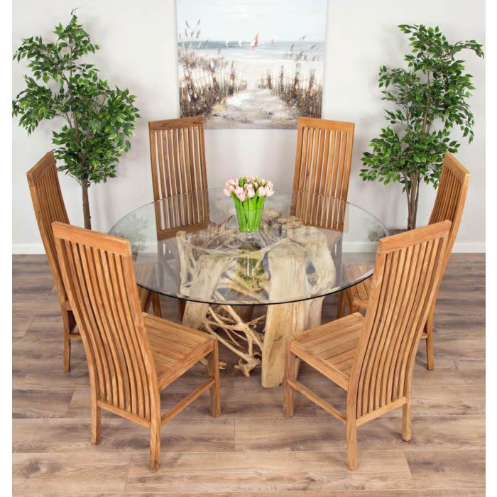 Our shabby chic Java root dining tables make an excellent conversation piece and will definitely impress your guests! The design of the Java roots are very modern and contemporary, which will fit in well with a retro shabby chic style in any dining area whether it be a conservatory, dining room or kitchen diner, the 1.5m root table can seat 6-8 people comfortably depending on which chairs you put with it. Although the Java roots have a hollow centre this does not take away from their sturdy nature and they can hold our toughened safety glass with ease! The overall design of the Java root has very intricate detailing which is specific to each root and you will never find no two roots that look the same, the bases are completely natural so they do come in different shapes and sizes. Excavating the roots encourages regrowth of forests and promotes sustainable livelihoods for local people. When creating these wonderful masterpieces there is no waste as any smaller pieces of teak root are sculpted into amazing individual mirror designs, stunning bowls or even root balls that can be used for various things. Paired with our elegantly high backed Vikka chairs that have a skirt to give the illusion of a very elongated back. Manufactured from reclaimed teak making these chairs extremely sturdy and robust, why not add a comfy cushion to the already comfortable Vikka chairs - See our drop-down menu.