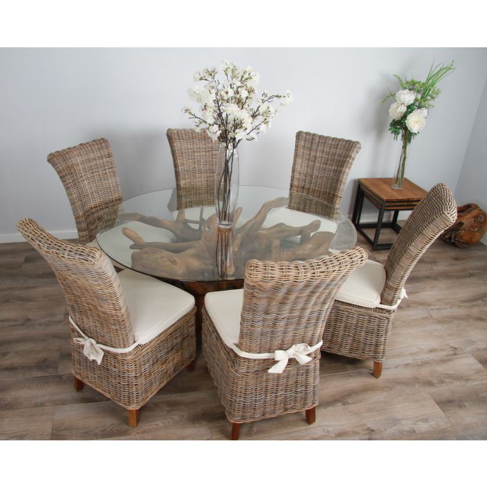 Our beautiful and striking Teak root dining tables are manufactured and handcrafted from reclaimed teak roots. Each root is completely unique including all the detailing, making this product completely bespoke and eye-catching. This table would make the perfect focal point for any room in your house. The great aspect of roots is nothing is wasted and it creates space for new teak trees to be planted, making it one of our most sustainable products out there. The roots have been excavated out of the ground from The National Indonesian Eco Programme which encourages the regrowth of forests and promotes sustainable livelihoods for local people. These tables are very similar to the one found on BBC's Saturday Kitchen television show on Saturday mornings. This root would comfortably seat 4 people and is paired with our popular Latifa Chairs. Made from Kubu Wicker making them extremely robust and stable. Each chair comes with a cushion in natural linen which is zip removable.