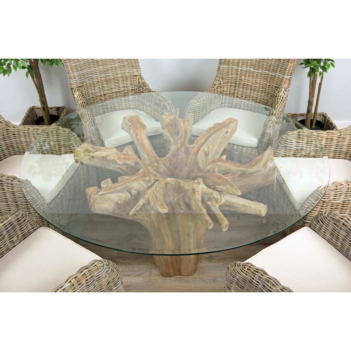 Our stunning and unique flute style teak root dining tables are becoming extremely popular with their ergonomic and intricate detailing which will grab your attention and be the topic of conversation over and over again! The flute roots have been hand crafted from one solid piece of root that has been excavated out of the ground from The National Indonesian Eco Programme which encourages regrowth of forests and promotes sustainable livelihoods for local people. The 1.5m Flute is our most sought after size from our root family, as many of our customers live in quaint cottages, city apartments and impressive statement homes around the country. The twists and turns of the root can really be appreciated with the crystal clear glass top, along side our natural wicker Donna armchairs that show case elegant curved edges and a comfortable feather like cushion which would accompany the root perfectly. The attractive kubu grey wicker makes the Donna armchairs extremely robust and stable perfect for a lovely dinner party to provide comfort and support to all of your guests.