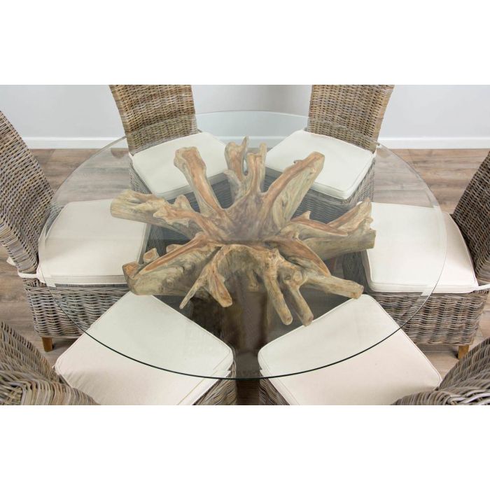 Our stunning and unique flute style teak root dining tables are becoming extremely popular with their ergonomic and intricate detailing which will grab your attention and be the topic of conversation over and over again! The flute roots have been hand crafted from one solid piece of root that has been excavated out of the ground from The National Indonesian Eco Programme which encourages regrowth of forests and promotes sustainable livelihoods for local people. The 1.5m Flute is our most sought after size from our root family, as many of our customers live in quaint cottages, city apartments and impressive statement homes around the country. The twists and turns of the root can really be appreciated with the crystal clear glass top, when paired with our Latifa chairs that ooze sophistication with their stylish high backs and neat tie back cushions it is sure to set the scene in any dining room. Although the Latifa's appearance is delicate and elegant it doesn't take away from it's sturdy and robust nature.