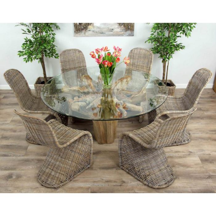 Our stunning and unique flute style teak root dining tables are becoming extremely popular with their ergonomic and intricate detailing which will grab your attention and be the topic of conversation over and over again! The flute roots have been hand crafted from one solid piece of root that has been excavated out of the ground from The National Indonesian Eco Programme which encourages regrowth of forests and promotes sustainable livelihoods for local people. The 1.5m Flute is our most sought after size from our root family, as many of our customers live in quaint cottages, city apartments and impressive statement homes around the country. The twists and turns of the root can really be appreciated with the crystal clear glass top, when paired with our unusually shaped and space saving alternative natural wicker Zorro chairs that offer a strong metal frame and elegant lines to give your dining room that contemporary edge.
