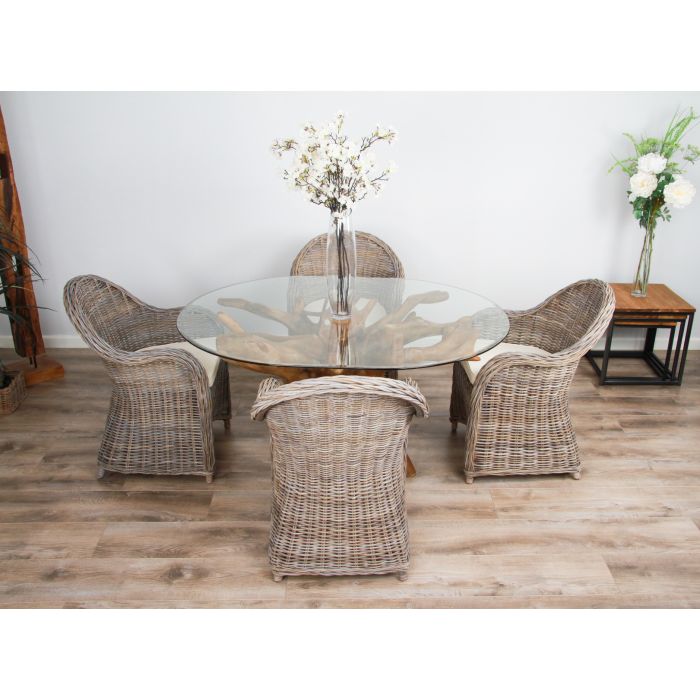 Our beautiful and striking Teak root dining tables are manufactured and handcrafted from reclaimed teak roots. Each root is completely unique including all the detailing, making this product completely bespoke and eye-catching. This table would make the perfect focal point for any room in your house. The great aspect of roots is nothing is wasted, and it creates space for new teak trees to be planted, making it one of our most sustainable products out there. The roots have been excavated out of the ground from The National Indonesian Eco Programme which encourages the regrowth of forests and promotes sustainable livelihoods for local people. These tables are very similar to the one found on BBC's Saturday Kitchen television show on Saturday mornings. This root would comfortably seat 4. This root is paired with our beautiful Riviera chairs with an elegantly curved back to offer style and support. Each chair comes with a cushion in natural linen. The glass top is made out of toughened safety glass that is 10mm thick with bevelled edges, which makes this glass top extremely heavy. It simply rests on top of the root and is supported very safely by the structure of the root base underneath. To keep your table in top condition, use our Briwax natural beeswax. With a clear finish, it can be applied to any surface quickly and easily to clean, polish and protect your wooden furniture against stains and scratches. Suitable for our Reclaimed teak, elm, pine, alba or oak furniture Briwax is the ultimate in universal furniture protection for raw untreated wood. Our teak roots can be used indoors or outdoors, if kept outdoors the teak root will weather to a silvery/grey colour if left untreated which will not affect the structural integrity of the teak root.   Measurements - Table - Height 76cm - Measurements may vary slightly Glass Size - Length 150cm x Width 120cm Chairs - Total - Width 65cm x Depth 65cm x Height 90cm             - Seat - Width 45cm x Depth 48cm x Height 50cm            - Armrest - Width 7cm x Height 68cm   Please Note - Delivery charges may apply when ordering a root dining table as they are very heavy, please call us on 01726 884123 to get the best delivery quote available. Email us at [email protected] with your requirements and we can send you some photographs of the roots we have in stock.