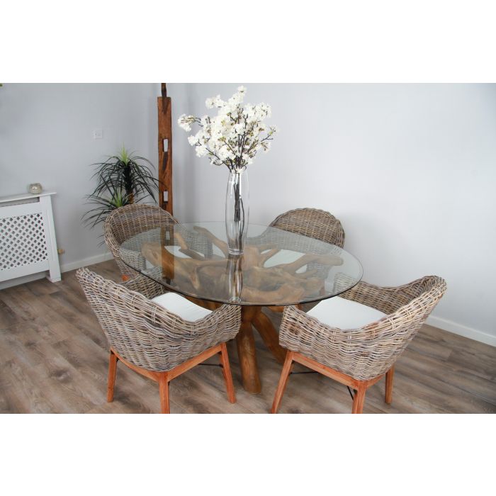 Our beautiful and striking Teak root dining tables are manufactured and handcrafted from reclaimed teak roots. Each root is completely unique including all the detailing, making this product completely bespoke and eye-catching. This table would make the perfect focal point for any room in your house. The great aspect of roots is nothing is wasted, and it creates space for new teak trees to be planted, making it one of our most sustainable products out there. The roots have been excavated out of the ground from The National Indonesian Eco Programme which encourages the regrowth of forests and promotes sustainable livelihoods for local people. These tables are very similar to the one found on BBC's Saturday Kitchen television show on Saturday mornings. This root would comfortably seat 4-6 people and this root is paired with our popular Scandi chairs. The chairs are a sustainable option and have been manufactured with the re-afforested mahogany framework and covered in an attractive natural Kubu grey wicker making them extremely robust and stable and come with a natural cushion.
