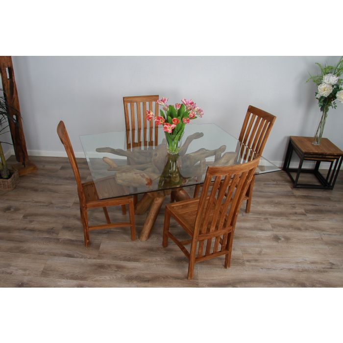 Our beautiful and striking Teak root dining tables are manufactured and handcrafted from reclaimed teak roots. Each root is completely unique including all the detailing, making this product completely bespoke and eye-catching. This table would make the perfect focal point for any room in your house. The great aspect of roots is nothing is wasted and it creates space for new teak trees to be planted, making it one of our most sustainable products out there. The roots have been excavated out of the ground from The National Indonesian Eco Programme which encourages the regrowth of forests and promotes sustainable livelihoods for local people. These tables are very similar to the one found on BBC's Saturday Kitchen television show on Saturday mornings. This root would comfortably seat 4/ 6 people and this root is paired with our elegant high-backed Santos dining chairs. The Santos chairs have an extra brace in between the legs, giving the chair its sturdy finish. With the Santos' high back, it adds style to your dining room and will really impress your guests. Handcrafted from sustainably sourced Teak using traditional joinery techniques. Each chair can be paired with a cushion in either natural or dove grey which is zip removable.