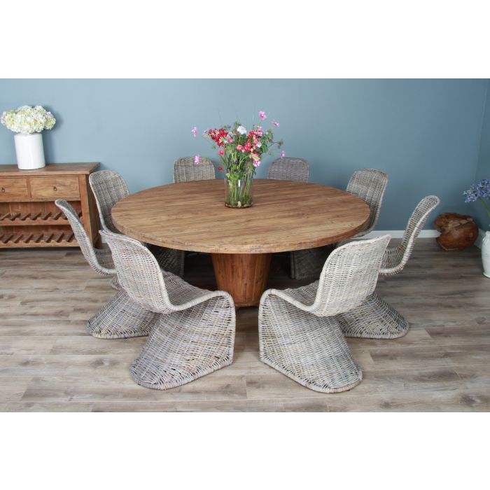 Create a dining room to be proud of with our impressive and appropriately named Character dining table. The beautifully crafted Reclaimed Teak tabletop has a rustic open slatted design made up from individual slats, that sits upon a barrel-style pedestal base. The natural timber has been lovingly crafted to keep its timeless rustic charm, that compliments homes with plenty of character particularly barn conversions, period properties and cottages. Accompanied by eight of our natural wicker Zorro chairs to make a stunningly unique dining set. These beautiful and stylish, yet extremely strong, sustainable stacking chairs offer an unusual and space-saving alternative. With its strong coated metal frame and elegant lines, it is the ideal Kubu wicker dining chair solution for any dining environment.