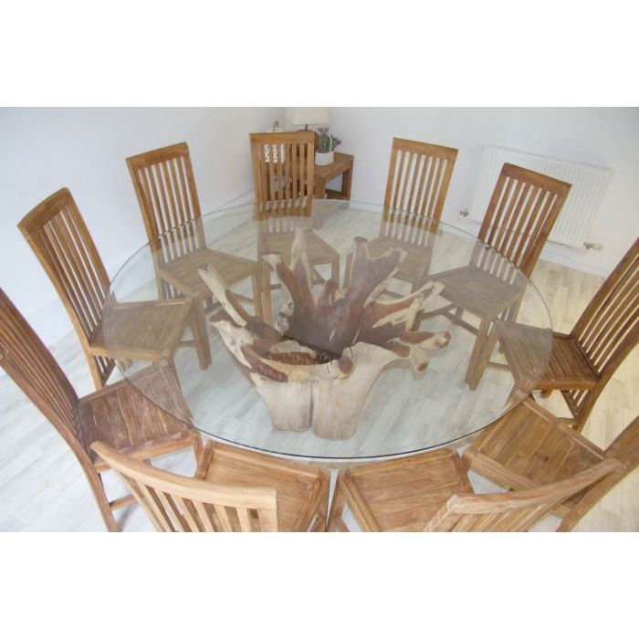 Our stunning and unique flute style teak root dining table has been manufactured from reclaimed teak root making this a very solid and strong centre piece to any dining area! Each root is very unique as these works of art differ from our standard teak roots due to theThe outer part of the root has a beautiful bleached effect that contrasts beautifully with the natural golden teak flute bowl and solid root base, you will never see the same root detailing twice, the sculptured root base is sourced from the National Indonesian Eco Programme. Excavating the roots encourages regrowth of forests and promotes sustainable livelihoods for local people. When creating these wonderful masterpieces there is no waste as any smaller pieces of teak root are sculpted into amazing individual mirror designs, stunning bowls or even root balls that can be used for various things. These are the tables similar to that found on BBC's Saturday Kitchen television show on Saturday mornings. Our 1.8m teak root is definately a statement piece as they are ideal for a larger dining area and can seat 8 people comfortably, with room to seat 10 people when needed - please see drop-down menu for more chair options, they are extremely heavy pieces but are absolutely stunning and will wow your guests everytime they come to visit for years to come. Paired with our elegantly high backed Santos chairs manufactured from reclaimed teak making these chairs extremely sturdy and robust especially witht the help of the extra bracing between the legs. Why not add a comfy cushion to the already comfortable Santos chairs - See our drop-down menu.