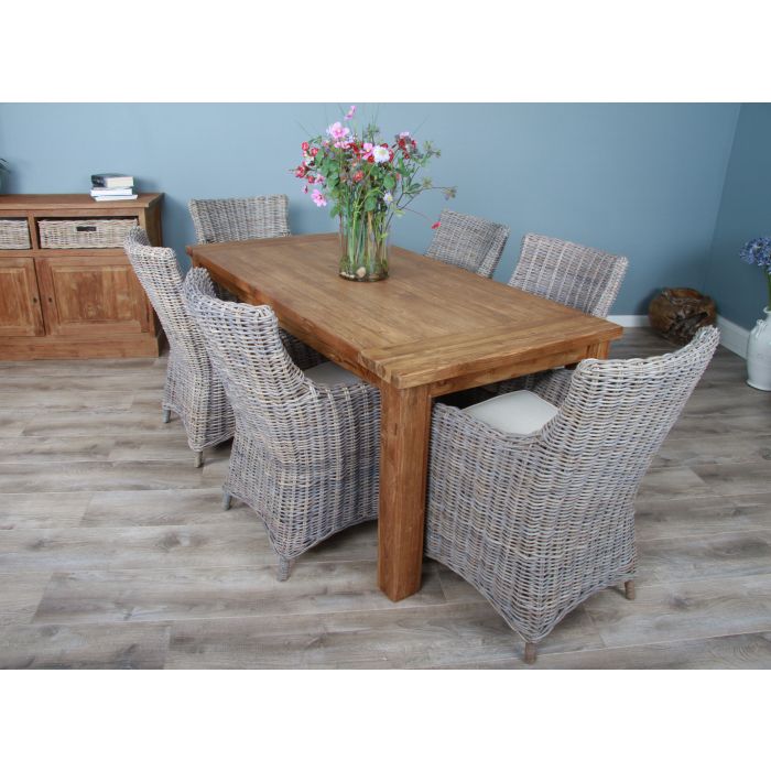 Spruce up your dining room with our 1.8m Taplock dining table which brings simplicity and rustic design together to create a great focal point in your dining room. Manufactured from reclaimed Teak and comes with a wax finish, although classically designed it offers optimum seating arrangements due to the chunky legs situated at each corner of the tabletop. Although the Donna chairs have a generous seat they still allow for plenty of space around the table for after-dinner drinks and relaxing. The Donnas sport a curved back and gentle armrest that holds you in position and offers maximum support. The warm tones running through the chair pick up the natural characteristics of the chair and the grain of the table. Â