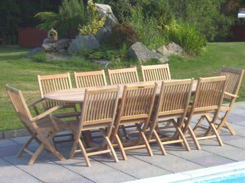 Our fabulous oval teak extending table is excellent value for money and will suit all your garden party requirements! The extending table offers flexible seating capacity for when you just need a quiet night in the garden or for those extravagant garden parties, when the table is not in use the extension piece can be folded away within the table for a clean-cut finish every time. You can comfortably seat 10 people using our Kiffa chairs & Armchair combo in comfort and style, which can be folded away for convenient and easy storage too. Manufactured from Grade A teak from Government controlled and managed fully certified timber where traditional joinery methods have been used with a fine hand-sanded finish.
