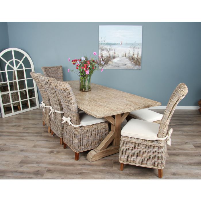 Our cross leg reclaimed Pine dining table beautifully combines country style with contemporary design and sustainability. At 2.4m in length, the table will comfortably accommodate 8 people, making it perfect for busy family life and dinner parties. The farmhouse style legs are slightly inset, allowing you to maximise dining space and use chairs along the entire length of the table. Paired with our elegant Latifa chairs and matching dining bench this set is given a true farmhouse vibe, with neatly tied bows on each chair to add a softer sophisticated touch. Each chair comes with a Natural linen cushion which is zip removable.