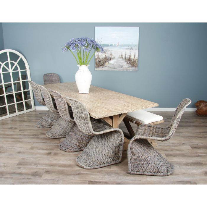 Bring the outside in with our country-style reclaimed Pine dining table, paired with our space-saving Zorro’s. At 2.4m in length, the table will comfortably accommodate 10 people, making it perfect for busy family life and dinner parties. The farmhouse style legs are slightly inset, allowing you to maximise dining space, especially with our Zorro chairs. The Zorro chairs feature a strong metal frame, placed in a unique 'Z' shape, this allows for the chairs to be stacked neatly when not in use. The matching dining bench optimises seating arrangements which makes this dining set a versatile contender for your dining room.