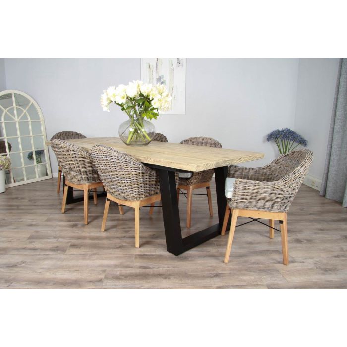 Our Cubex tables bring together authentic natural table tops with captivating statement black metal legs for a look that will not disappoint. We've softened the industrial look of this set with our modern Scandi armchairs which completes the look perfectly. The solid timber table top has been finished with a grey wash to enhance the wood's natural grain which is perfectly complemented by the grey tones running through the natural wicker chairs.