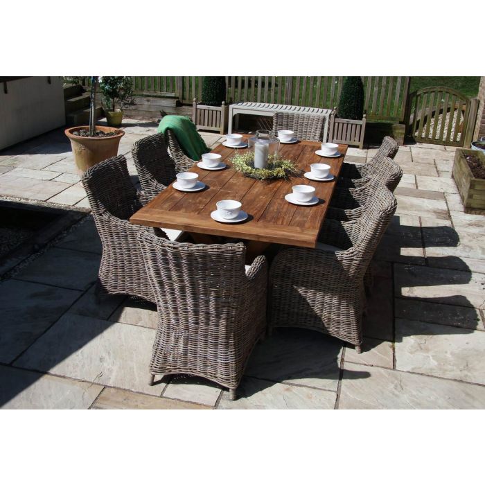 Our luxury cross leg dining is finished with crisp, clean-cut edges that have been handcrafted with care and precision to give your garden that sophisticated touch of elegance. The contemporary cross leg design is not only stylish and effective but it provides strength and stature to the table, which has been manufactured from Reclaimed Teak this allows the natural grain of the timber to be appreciated and gives the chunky table top its rustic aura. The slim gaps in the tabletop allow for water to run off freely which also give the table its in-depth design alongside the neat taplock ends. Our Donna dining chairs have become extremely popular when paired with our reclaimed teak tables, they are great for outdoor use as the mahogany framework has been covered in an attractive natural Kubu grey wicker making them extremely robust and stable. Although the Donna dining chair is very sturdy this does not take away from its curved and flowing lines which oozes elegance. Although the design and appearance are simply fabulous the Donna does not fall short on comfort, you can spend hours sitting at the table for after-dinner drinks. The Reclaimed Teak has a wax finish that will deteriorate over time, at this stage if you would like to maintain the bench's cosmetic appearance our Protection Oil can be applied, which is perfect for protecting your garden furniture and keeping its fresh new look. The bench can be left outside all year round and if it's left untreated, it will weather to a charming silvery/grey colour which some people prefer, to find out more about our Protection Oil, please click here Protection Oil can only be applied to the table once the wax finish has deteriorated. Available in three sizes - 200cm, 240cm and 300cm.   Measurements - Table - Length 240cm x Width 110cm x Height 75cm          - Overhang at Headends - 26cm          - Support Bar Height - 32cm          - Tabletop Thickness - 4cm          - Leg Thickness - 10cm Chairs - Width 57cm x Depth 65cm x Height 92cm           - Seat - Width 42cm x Depth 46cm x Height 47cm           - Armrest - Height 66cm   Some assembly required   Washing Instructions - We advise hand-washing the cushions in warm water and rinsing by hand, to remove any excess water spin cushion cover in the washing machine. Finally, add cover to the cushion when damp.
