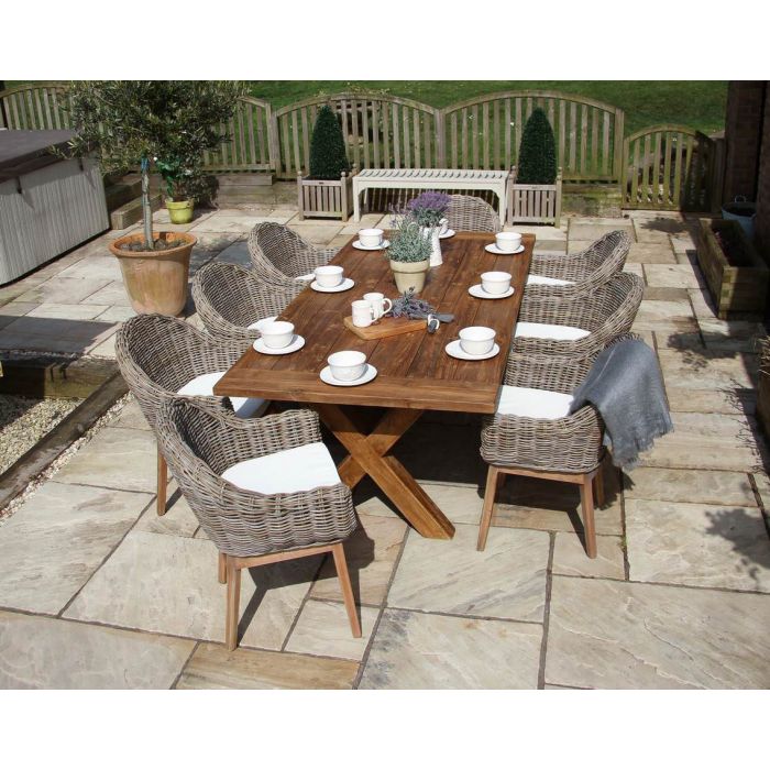 Our luxury cross leg dining is finished with crisp, clean-cut edges that have been handcrafted with care and precision to give your garden that sophisticated touch of elegance. The contemporary cross leg design is not only stylish and effective but it provides strength and stature to the table, which has been manufactured from Reclaimed Teak this allows the natural grain of the timber to be appreciated and gives the chunky table top its rustic aura. The slim gaps in the tabletop allow for water to run off freely which also give the table its in-depth design alongside the neat taplock ends.