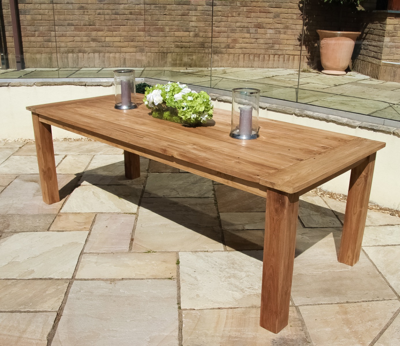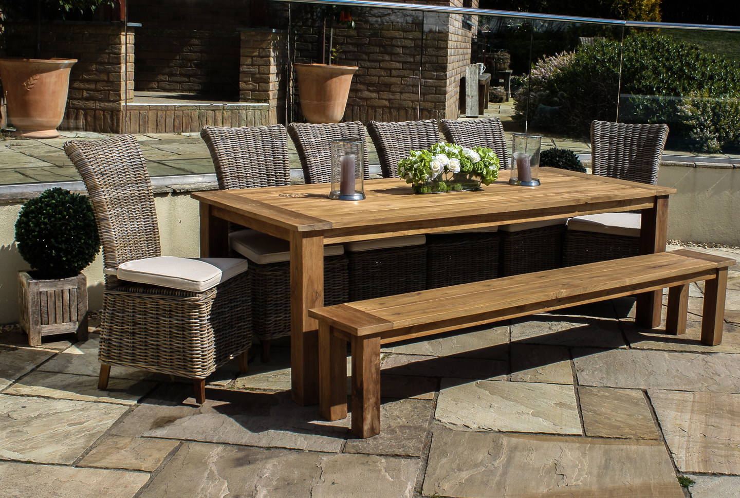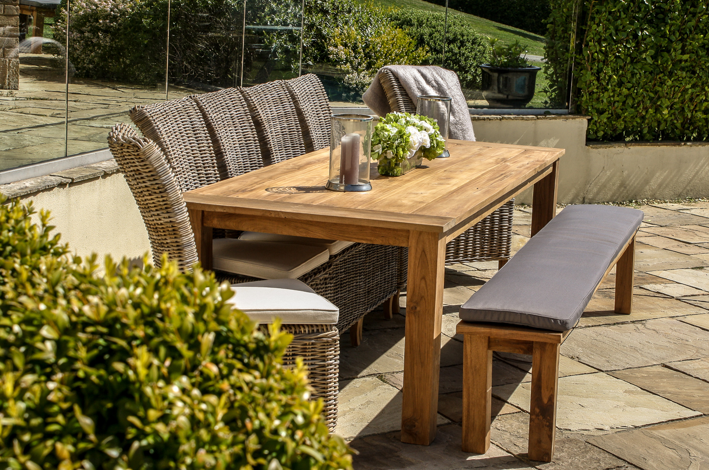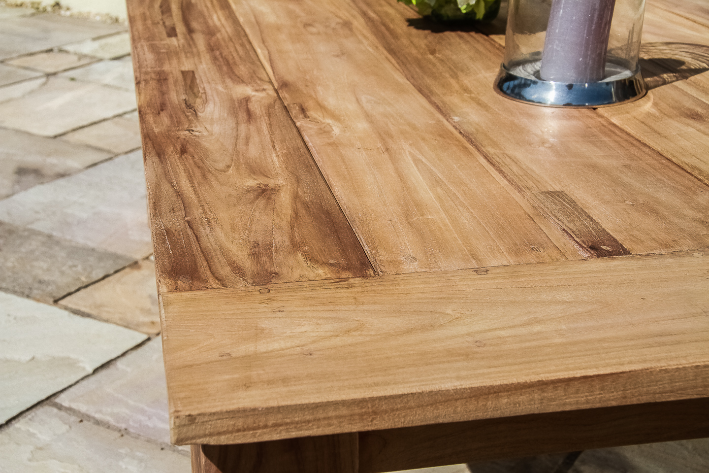 The Reclaimed Teak has a wax finish that will deteriorate over time, at this stage if you would like to maintain the table's cosmetic appearance our Protection Oil can be applied, which is perfect for protecting your garden furniture and keeping its fresh new look. The bench can be left outside all year round and if it's left untreated, it will weather to a charming silvery/grey colour which some people prefer, to find out more about our Protection Oil, please click here. Protection Oil must only be applied to the table once the wax finish has deteriorated.