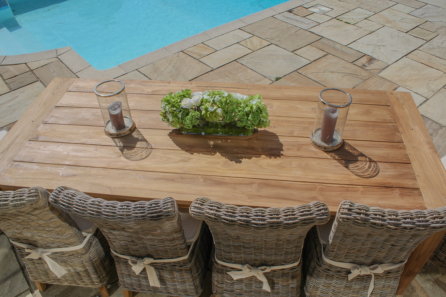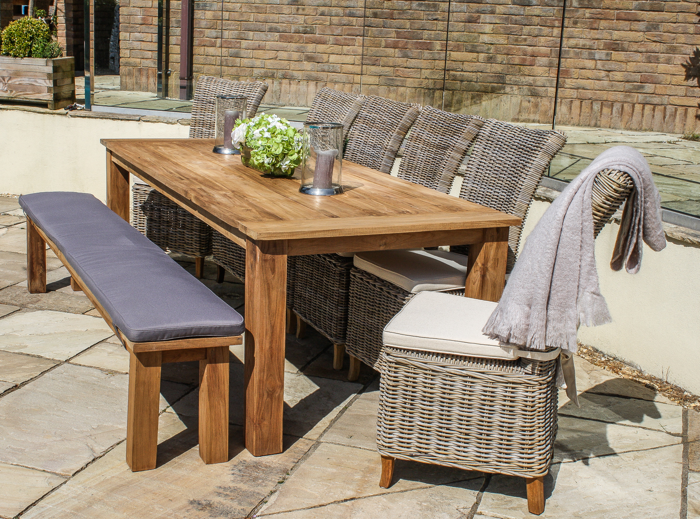 Our beautiful 2m Open Slatted Teak dining table with 1 Bench and 6 Latifa Chairs is perfect for outdoor use when you are having friends and family over for that all-important Summer BBQ! Its stunning, sustainable natural wood effect is achieved by using reclaimed teak timber from old colonial buildings, therefore making it the ultimate sustainable product. Traditional carpentry techniques and quality fixings make this bench hard-wearing and long-lasting. The recycled timber used to make this table and bench does not impact the strength of the product, the seasoned wood only adds to the durability and longevity of the already strong and hard teak timber, this furniture set can be left outside all year round and will not break or become brittle.