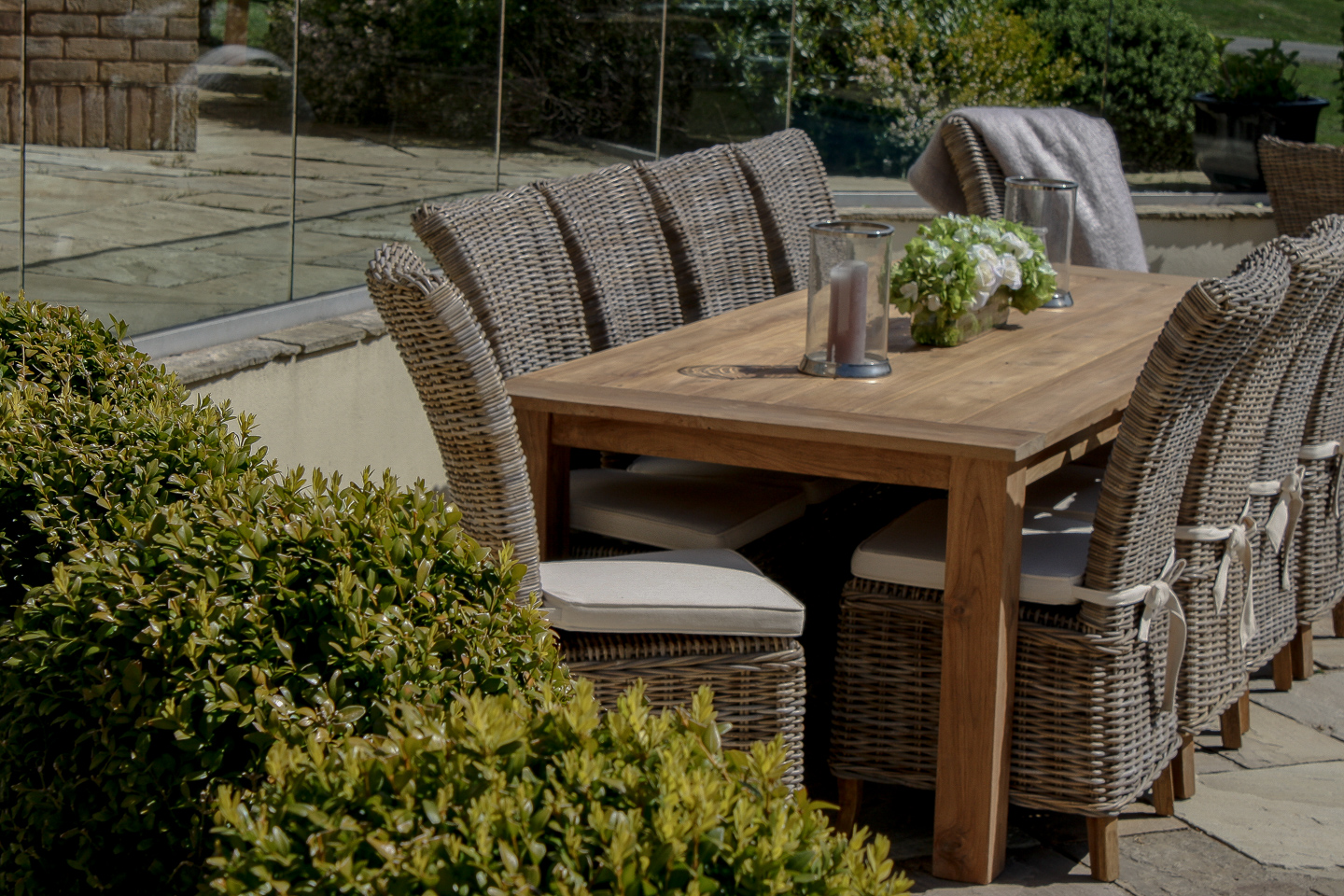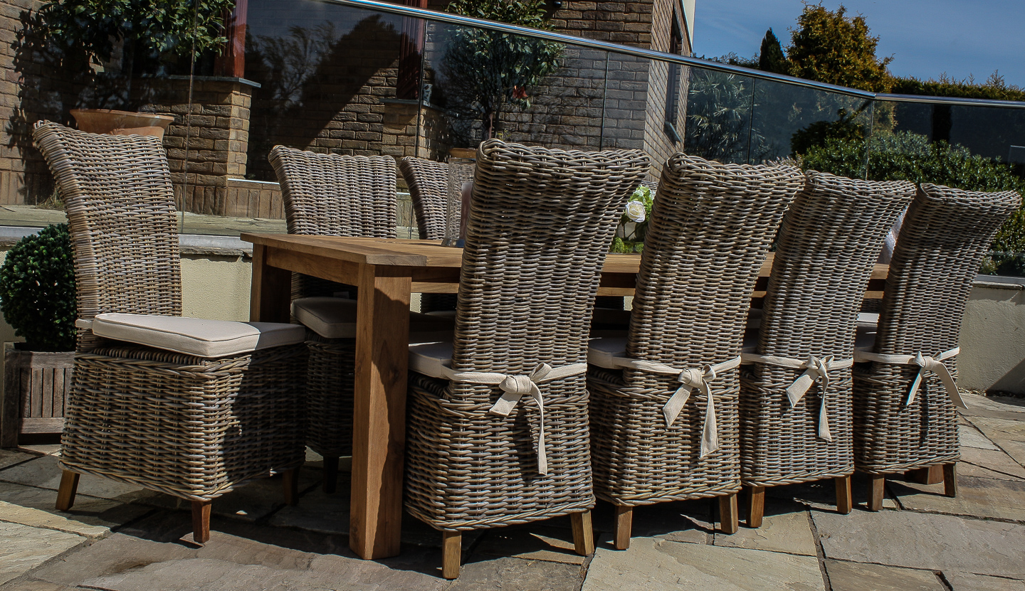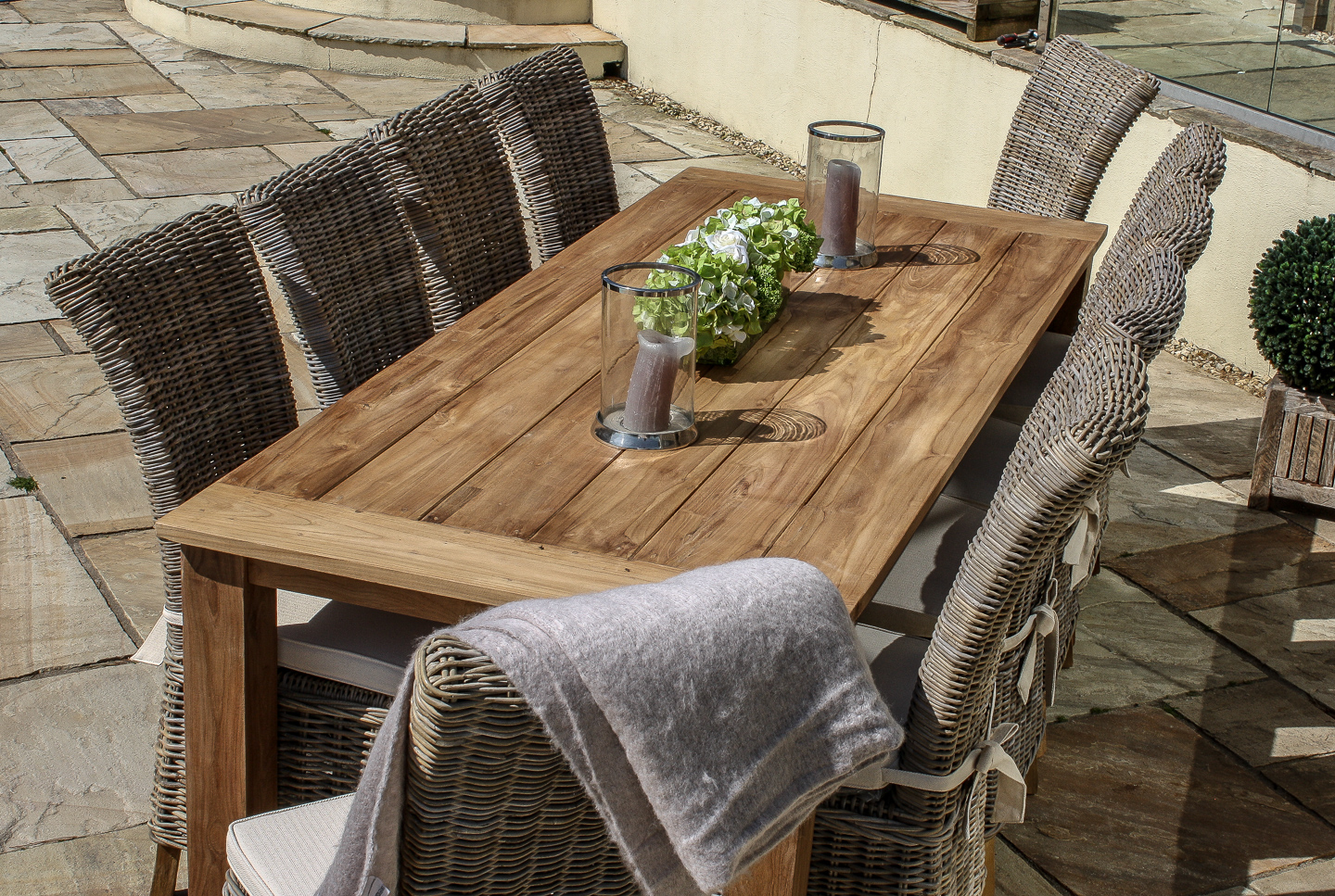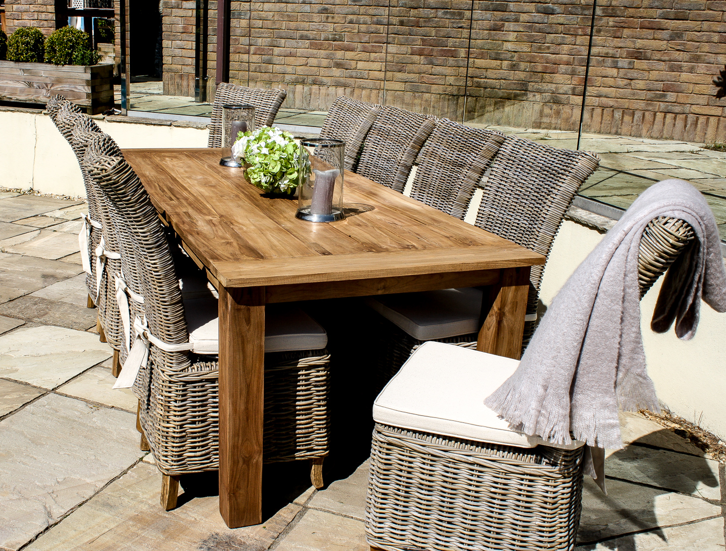 This beautiful 10-seater Reclaimed Teak Dining Table is perfect for indoor or outdoor use. Its stunning, sustainable natural wood effect is achieved by using reclaimed teak wood from Old Colonial buildings and therefore making it the ultimate sustainable product. Traditional carpentry techniques are used to comprise this amazing piece of furniture and light buffing of the wood materials provides a high-quality smooth finish. Although this timber is recycled it does not impact the strength of the product, the seasoned wood only adds to the durability and longevity of already strong and hard teak wood. This set is accompanied by our Latifa Wicker Chairs. Stylish natural heavy-duty wicker/rattan comfortable yet extremely robust teak framed Kubu indoor or outdoor dining. These sustainable Kubu natural wicker chairs have comfortable and stylish high backs and strong structures making the chair extremely stable and solid.