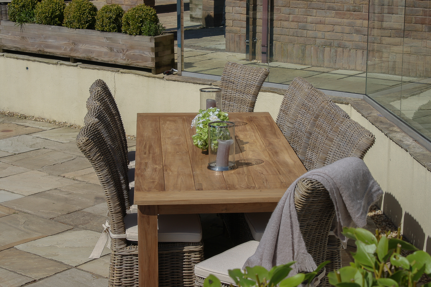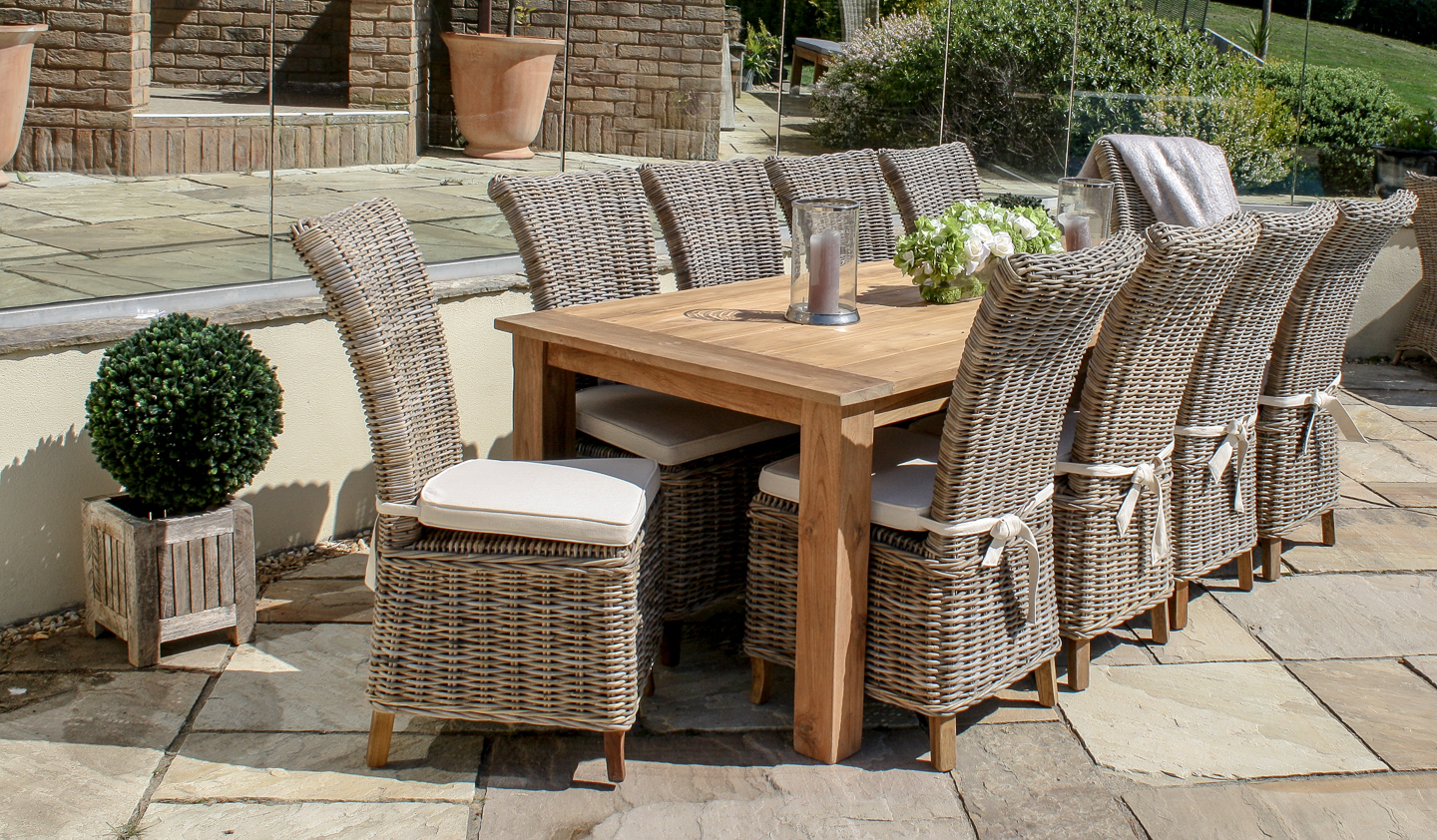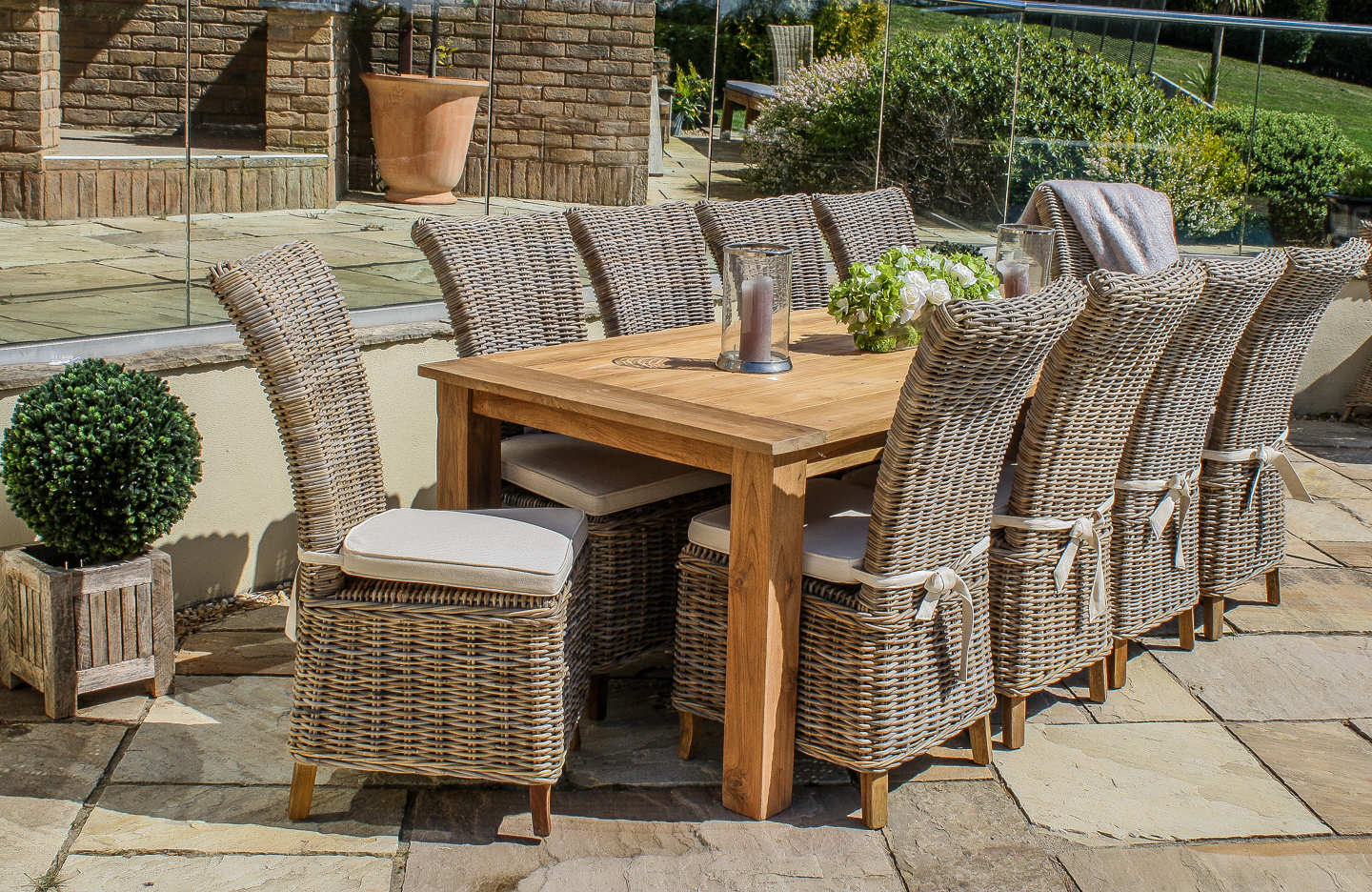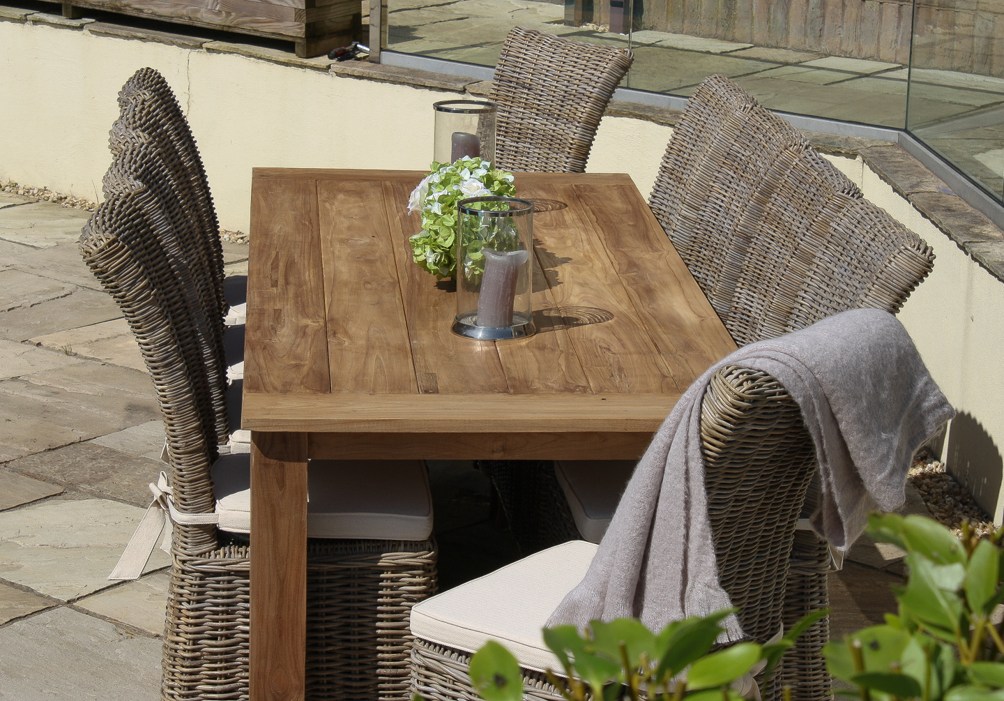 This beautiful 10-seater Reclaimed Teak Dining Table is perfect for indoor or outdoor use. Its stunning, sustainable natural wood effect is achieved by using reclaimed teak wood from Old Colonial buildings and therefore making it the ultimate sustainable product. Traditional carpentry techniques are used to comprise this amazing piece of furniture and light buffing of the wood materials provides a high-quality smooth finish. Although this timber is recycled it does not impact the strength of the product, the seasoned wood only adds to the durability and longevity of already strong and hard teak wood. This set is accompanied by our Latifa Wicker Chairs. Stylish natural heavy-duty wicker/rattan comfortable yet extremely robust teak framed Kubu indoor or outdoor dining. These sustainable Kubu natural wicker chairs have comfortable and stylish high backs and strong structures making the chair extremely stable and solid.