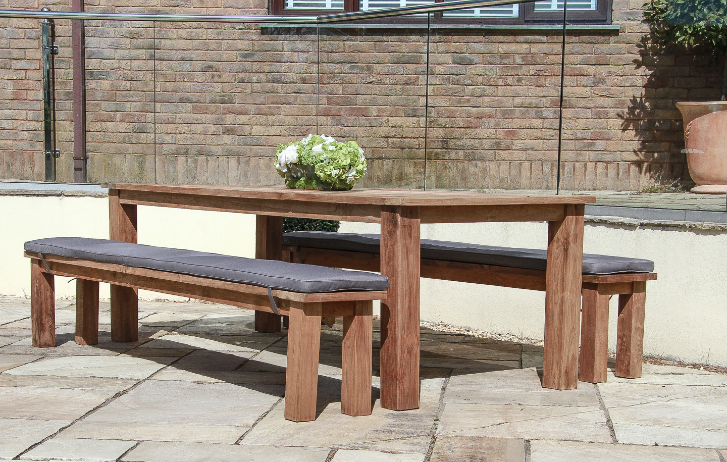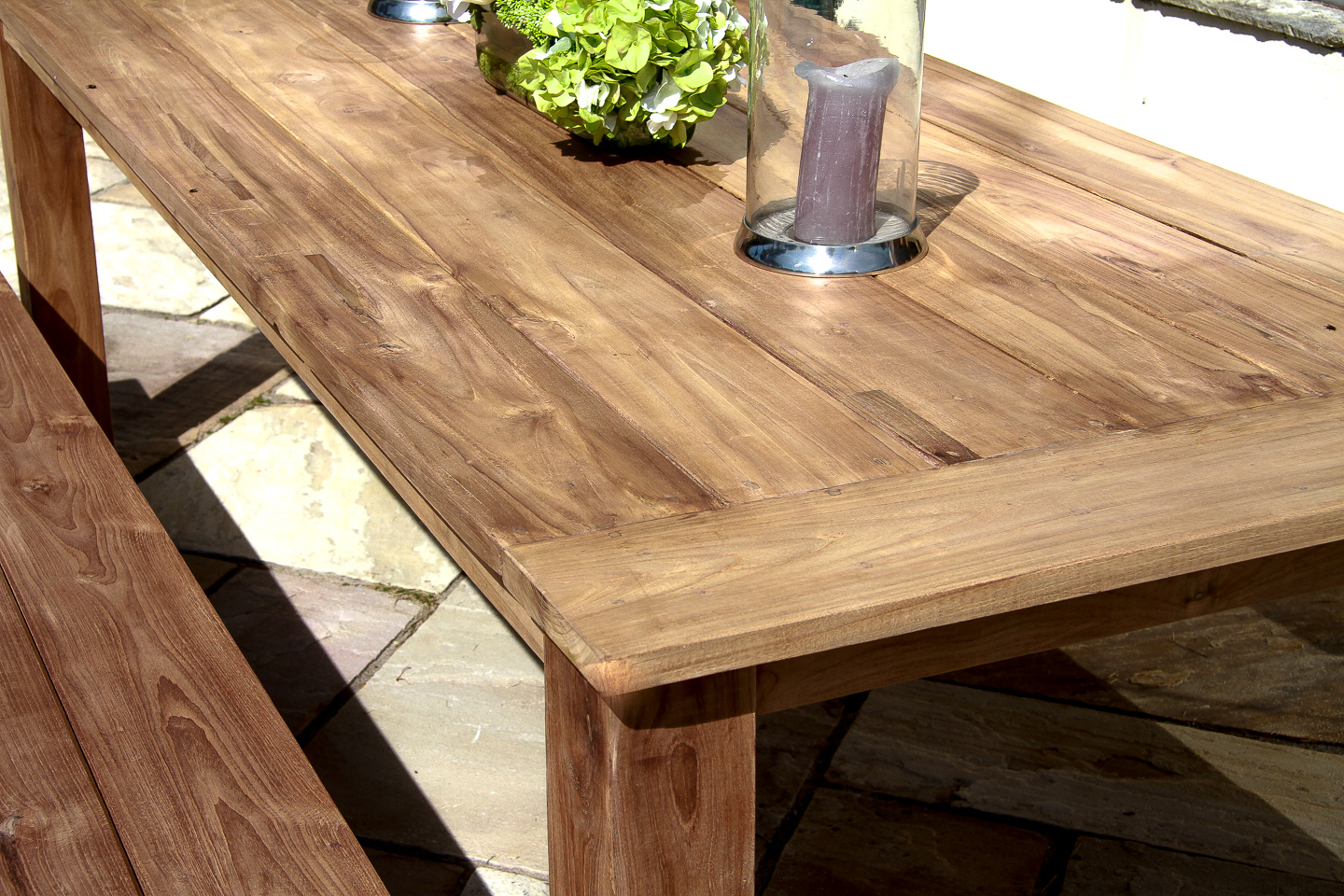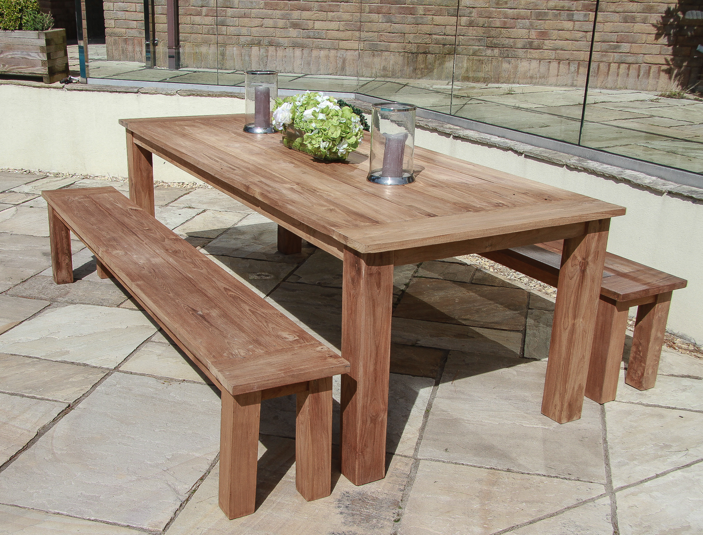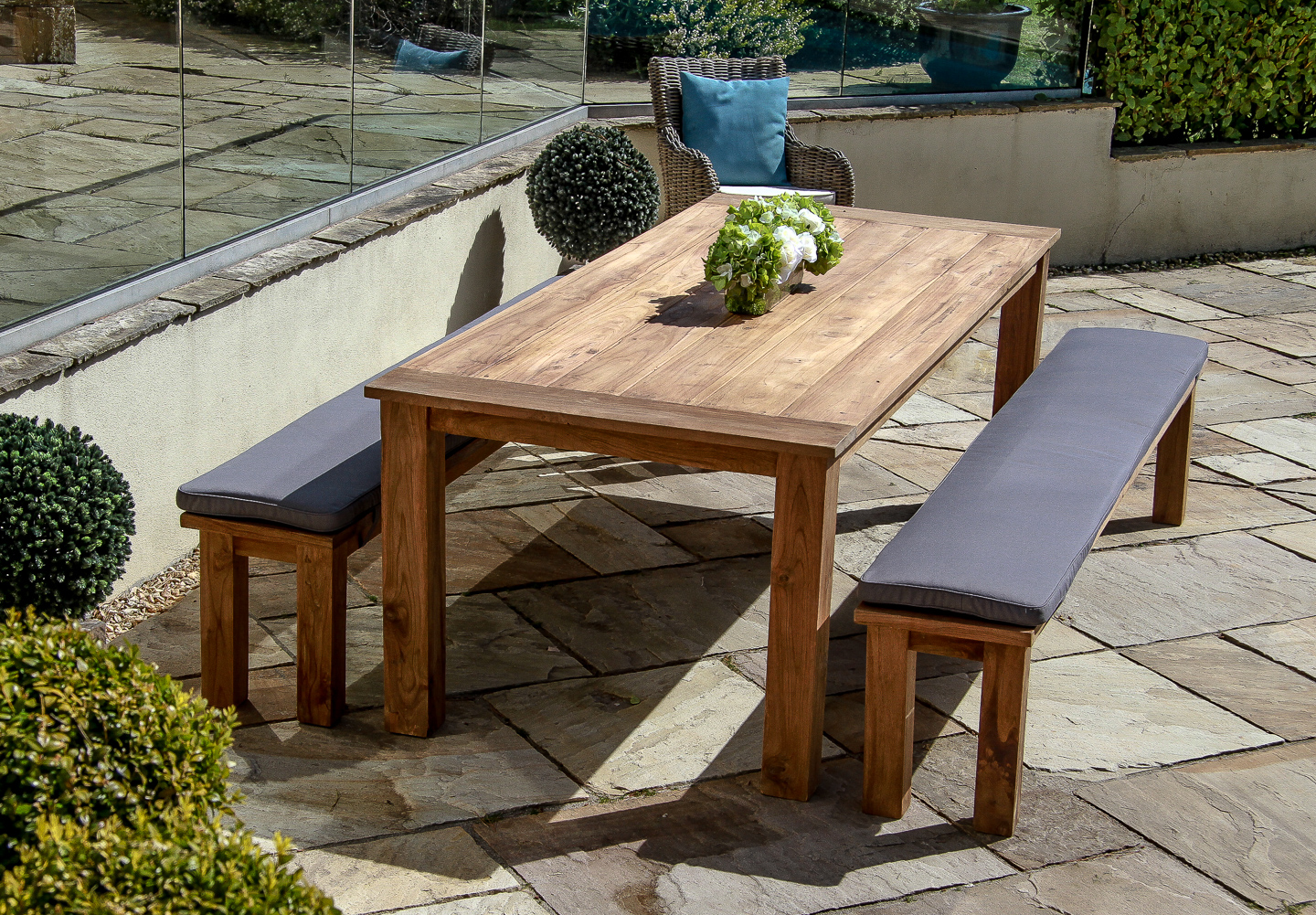 Our 2.4m Teak Open Slatted Dining Table teamed with 2 benches is perfect for outdoor use and would be ideal for a larger garden to accommodate all of your guests at a social gathering! The chunky and solid table is very rustic which is very fitting if you happen to live in the country, manufactured from reclaimed teak salvaged from old Colonial buildings in Indonesia and reworked to produce a beautiful piece of sustainable furniture. Where quality craftsmanship and fixings make this table last even longer, each reclaimed teak table is unique and individual, it should be noted that it will have unique and individual features that result in charming rustic character. The Teak open slatted dining table can be left outside all year round and will not break or become brittle.