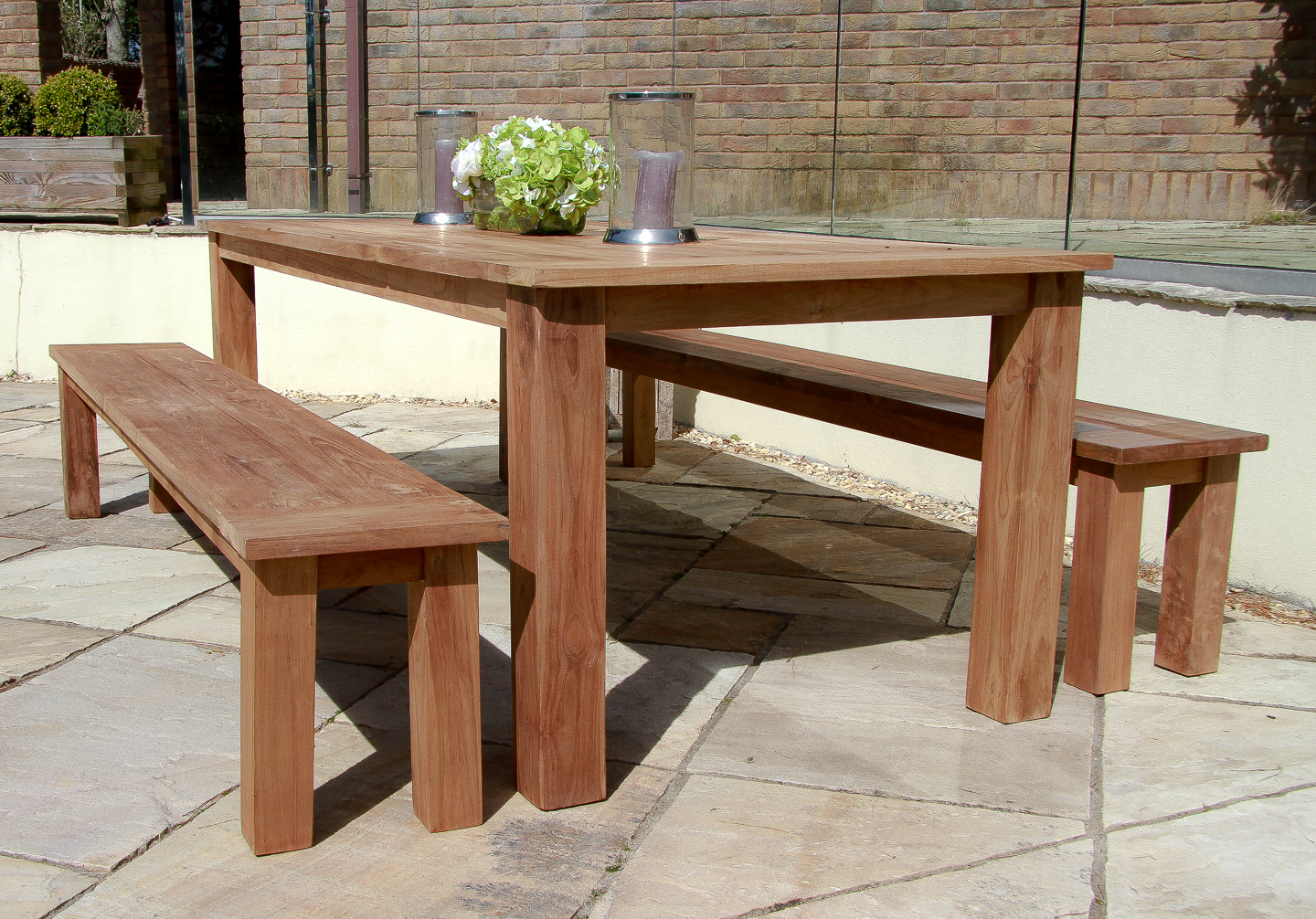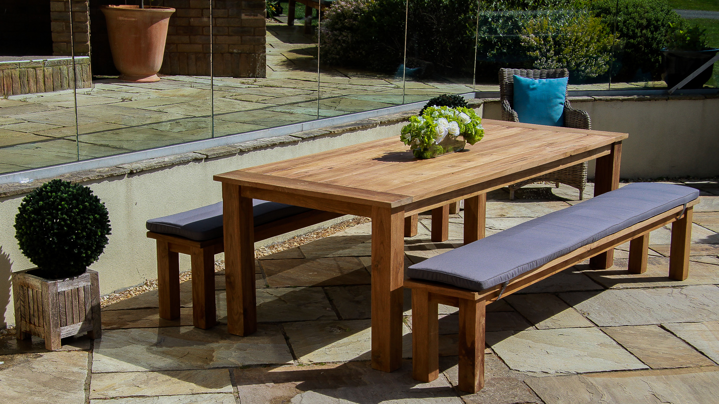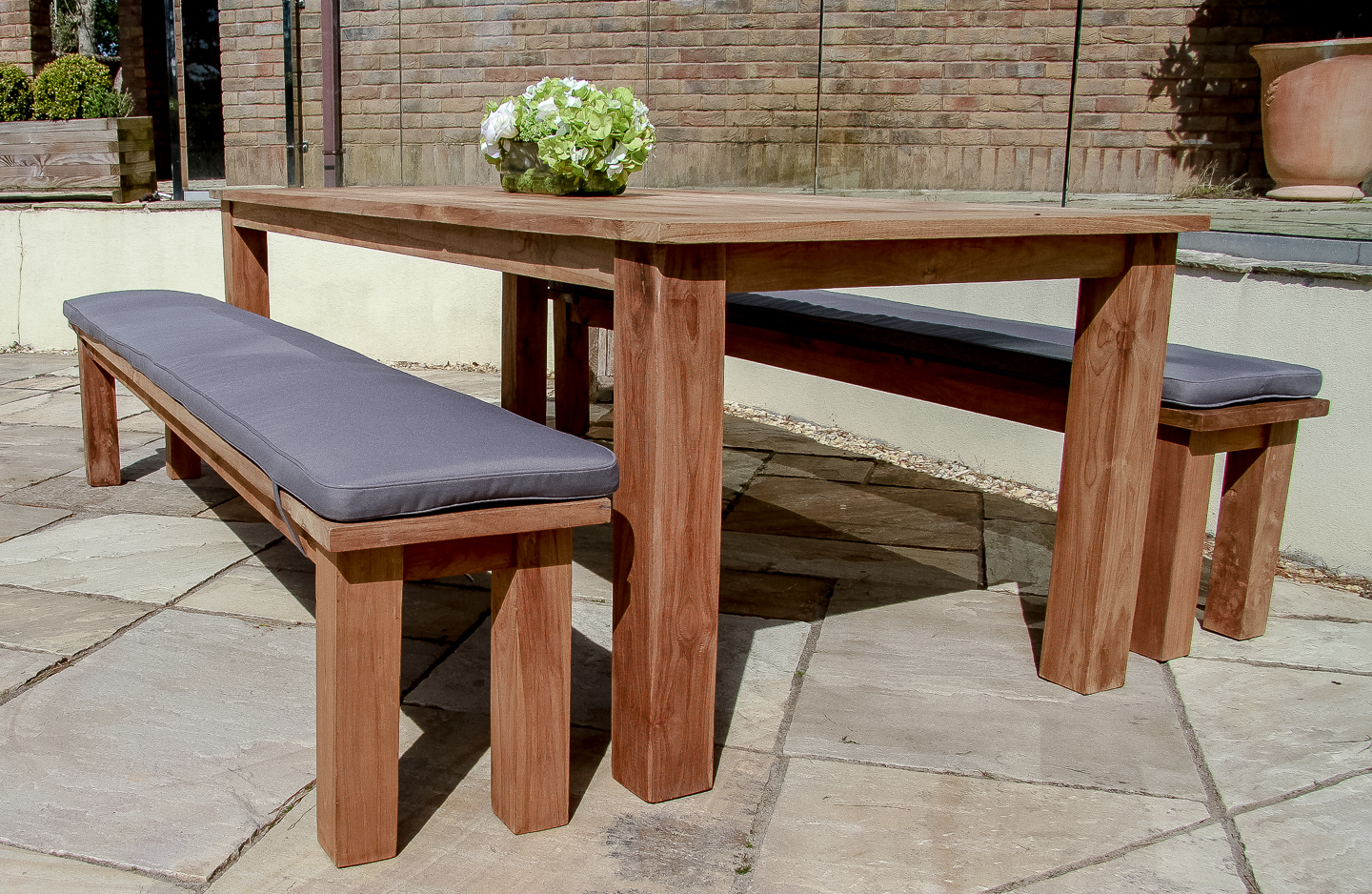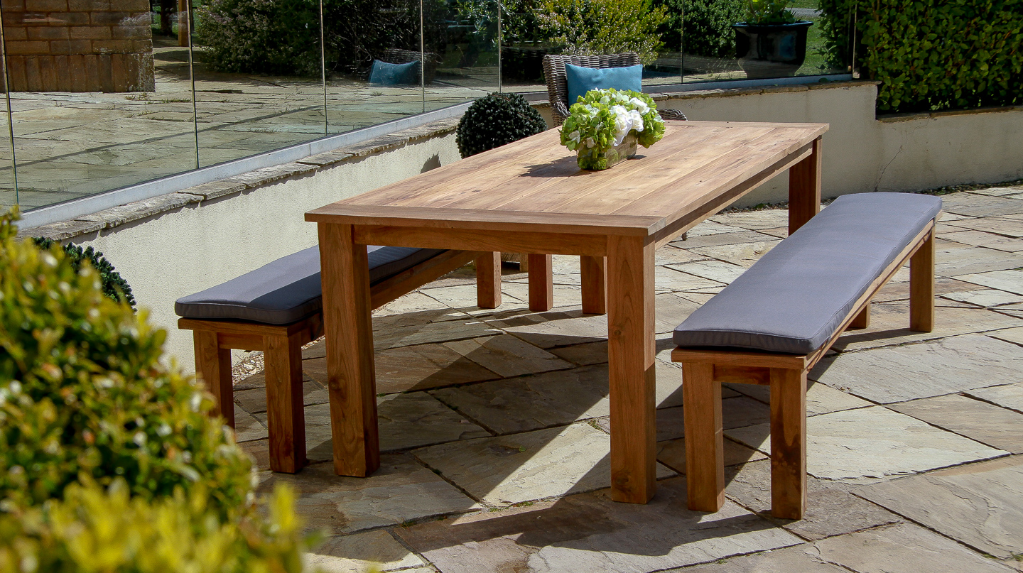 Our 2.4m Teak Open Slatted Dining Table teamed with 2 benches is perfect for outdoor use and would be ideal for a larger garden to accommodate all of your guests at a social gathering! The chunky and solid table is very rustic which is very fitting if you happen to live in the country, manufactured from reclaimed teak salvaged from old Colonial buildings in Indonesia and reworked to produce a beautiful piece of sustainable furniture. Where quality craftsmanship and fixings make this table last even longer, each reclaimed teak table is unique and individual, it should be noted that it will have unique and individual features that result in charming rustic character. The Teak open slatted dining table can be left outside all year round and will not break or become brittle.