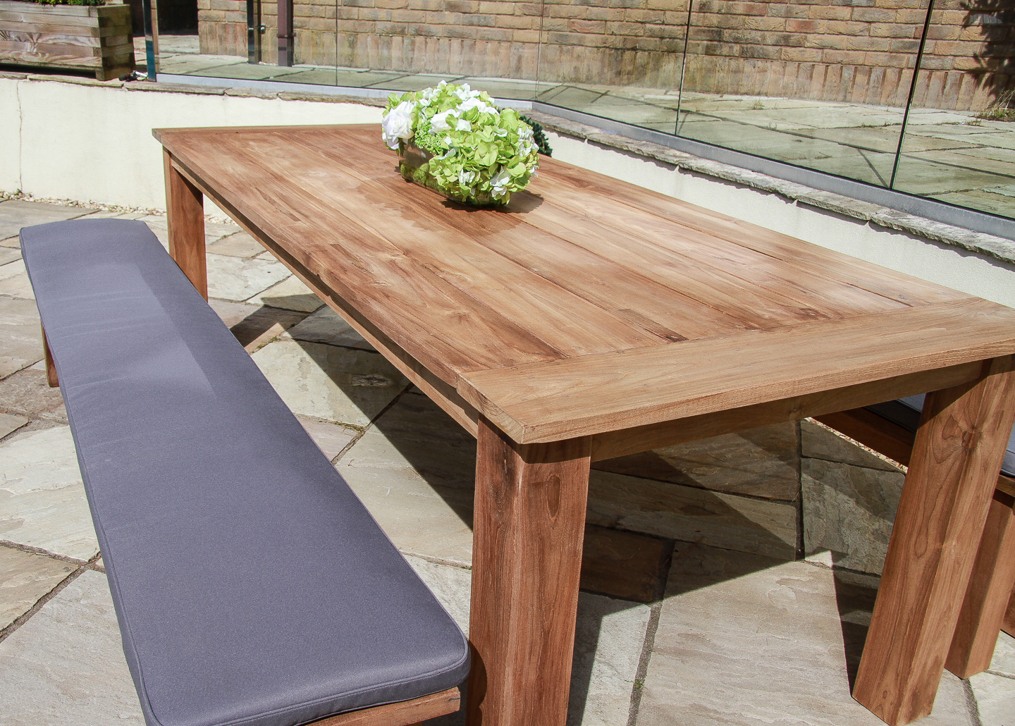 The Reclaimed Teak has a wax finish that will deteriorate over time, at this stage if you would like to maintain the table's cosmetic appearance our Protection Oil can be applied, which is perfect for protecting your garden furniture and keeping its fresh new look. The bench can be left outside all year round and if it's left untreated, it will weather to a charming silvery/grey colour which some people prefer, to find out more about our Protection Oil, please click here. Protection Oil must only be applied to the table once the wax finish has deteriorated.