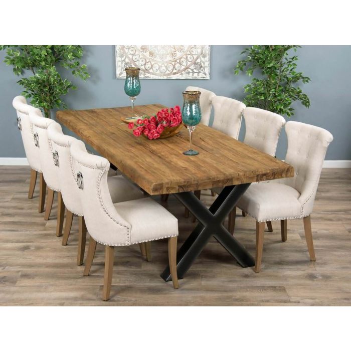 Our Urban Fusion range is growing at a rapid rate and we just adore it! The 2.4m dining table would be perfect if you cant quite fit a larger table in as it still seats an impressive 8 to 10 people which enables you to still host your luxurious dinner parties. The cross dining table has a seamlessly rustic reclaimed teak table top where the characterful grain of the timber can really be appreciated, the legs are a unique cross shape that is made from iron providing strength and durability. The Urban Fusion cross dining table has been paired with our luxurious Windsor Ring Back dining chairs in Natural to add style and sophistication to a seamlessly rustic set, the seat has been filled with foam and sprung webbing to offer maximum comfort and support that will not sag over time and remain plump for years to come.