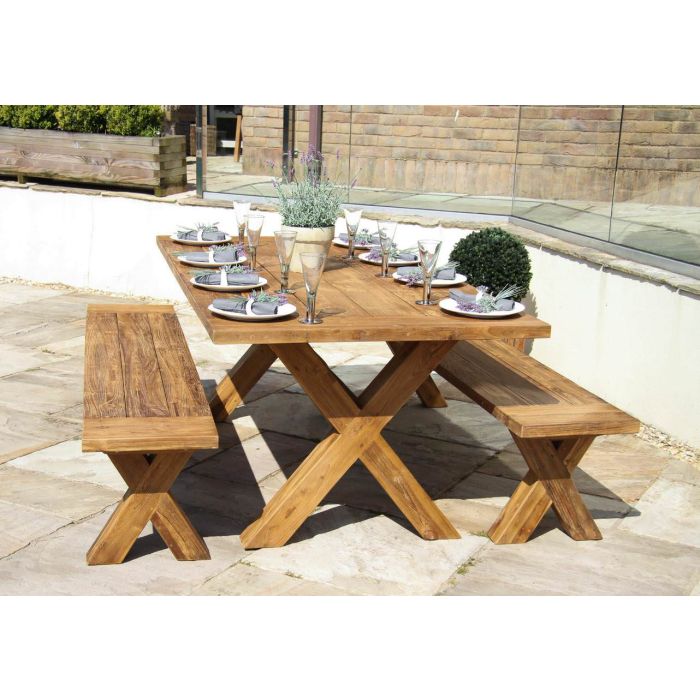 Our 2m Reclaimed Teak Cross Leg Garden table showcases crisp-cut edges that have been handcrafted with care and precision to give your garden that sophisticated touch of elegance. The simple yet effective cross leg design not only gives strength and stature to the table but offers a stylish and distinct opposition to any other Teak tables that are on the market. The cross leg table has been manufactured from Reclaimed Teak which allows the natural grain of the timber to be appreciated and gives the chunky tabletop its rustic aura, the slim gaps in the tabletop allow for water to run off freely which also give the table its in-depth design alongside the neat taplock ends. The matching cross leg dining benches set this table apart from the rest creating the ultimate outdoor dining set that will give your garden the confident and gratifying look it deserves. The dining bench has identical qualities to the table such as the taplock ends and chunk leg design which provides strength and stability. The cross leg design is also staggered to enable the benches to be tucked underneath the table neatly, this set will seat 8 people comfortably with a little room to squeeze an extra person on if needs be.