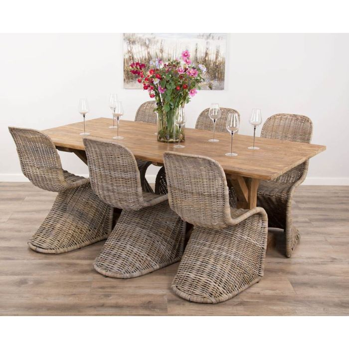 The generously proportioned dinklik dining table is perfect for family dining and entertaining alike, it has a seamlessly rustic reclaimed teak tabletop where the characterful grain of the timber can really be appreciated, the legs are a unique shape providing strength and durability. This practical set features six of our versatile zorro dining chairs which can be stacked together when not in use.