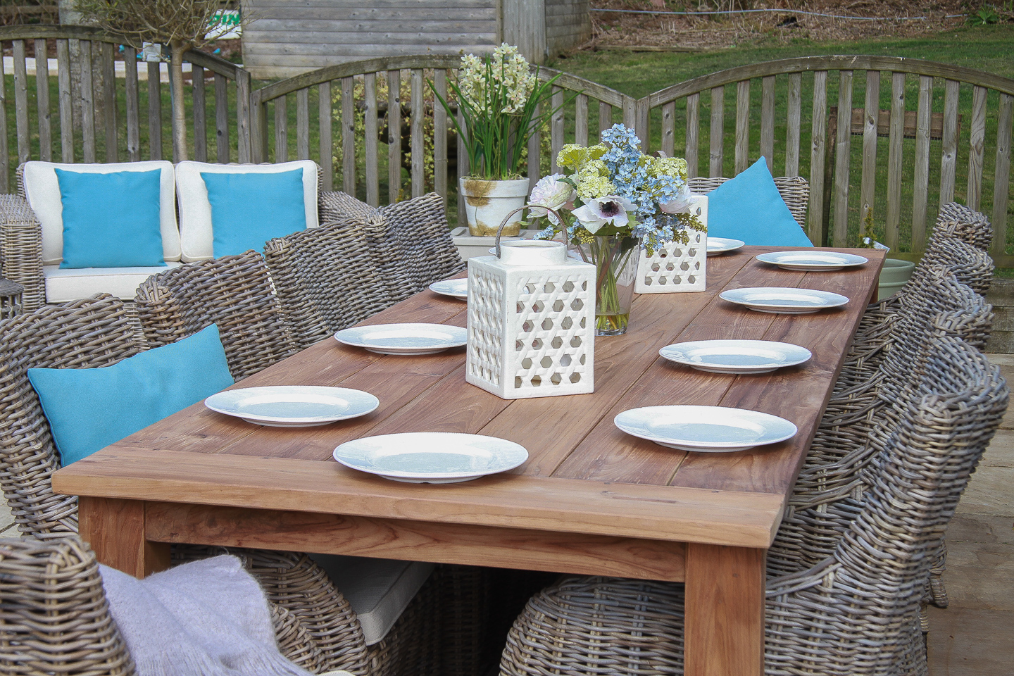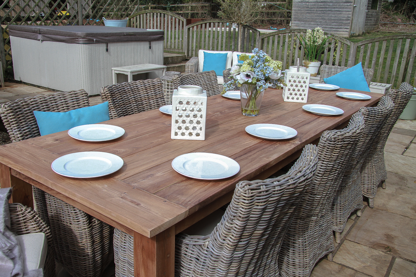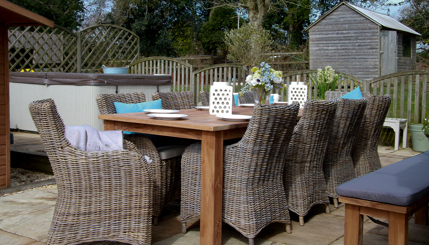 This beautiful 10 seater Reclaimed Teak Dining Table is perfect for indoor or outdoor use. Its stunning, sustainable natural wood effect is achieved by using reclaimed teak wood from Old Colonial buildings and therefore making it the ultimate sustainable product. Traditional carpentry techniques are used to comprise this amazing piece of furniture and light buffing of the wood materials provides a high-quality rustic finish. Although this timber is recycled it does not impact the strength of the product, the seasoned wood only adds to the durability and longevity of already strong and hard teak wood. Our Donna chairs are a very sustainable option manufactured with the re-afforested mahogany framework and covered in an attractive natural Kubu grey wicker making them extremely robust and stable. Although a very sturdy chair this does not take away from the elegant appearance of the Donna with its curved edges and comfortable feather-like cushion.