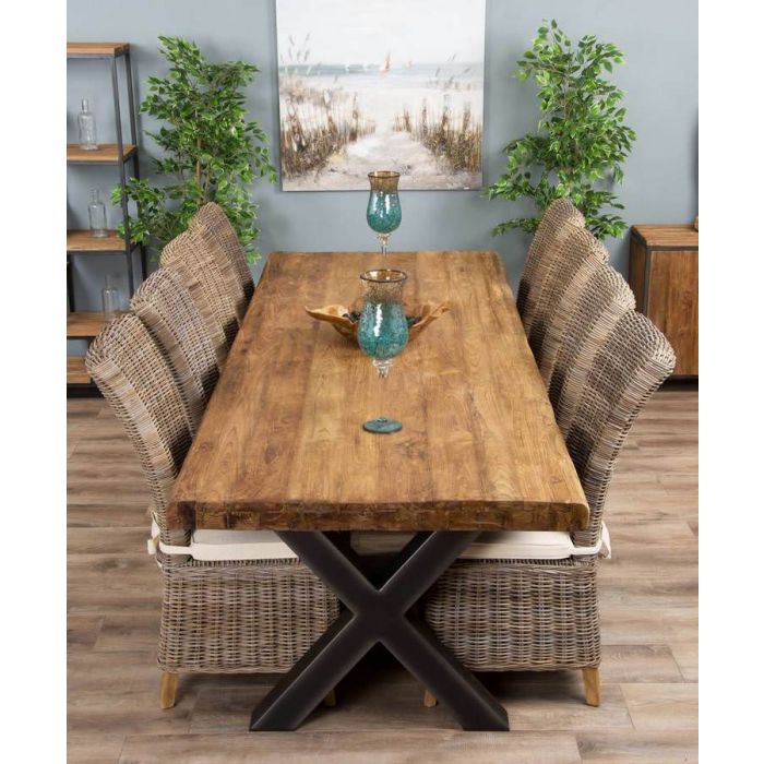 We have another member that has been added to our Urban Fusion collection and we absolutely love it! The 3m dining table has a seamlessly rustic reclaimed teak table top where the characterful grain of the timber can really be appreciated, the legs are a unique cross shape that is made from iron providing strength and durability. The Urban Fusion cross dining table has been paired with our natural wicker Latifa dining chairs that feature elegant high backs with a cream cushion that ties neatly around the back of the chair, the Latifas are not only stylish but robust and hard-wearing. We advise hand washing the cushions in warm water and rinsing by hand, to remove any excess water spin cushion cover in washing machine. Finally add cover to cushion when damp.