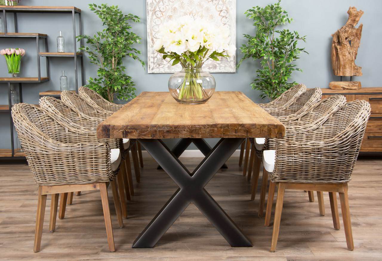 We have another member that has been added to our Urban Fusion collection and we absolutely love it! The 3m dining table has a seamlessly rustic reclaimed teak table top where the characterful grain of the timber can really be appreciate, the legs are a unique cross shape that is made from iron providing strength and durability. We have paired the Urban Fusion cross dining table with eight or ten of our Scandi Armchairs and we think they look fab, if you choose to seat two guests at the ends of the table leg room may be limited but the option is there and the measurements are available below when you are in desperate need to fit your family around for that all important dinner! Our Scandi Armchairs are made from Kubu grey wicker and have sturdy reclaimed teak legs that offer durability and ensure this chair is a long lasting product.