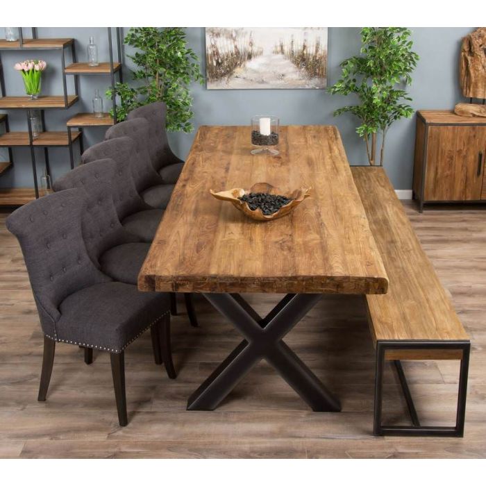 We have another member that has been added to our Urban Fusion collection and we absolutely love it! The 3m dining table has a seamlessly rustic reclaimed teak table top where the characterful grain of the timber can really be appreciated, the legs are a unique cross shape that is made from iron providing strength and durability. The Urban Fusion cross dining table has been paired with our Urban Fusion Backless Bench to provide relaxed seating meaning you can have 6 people comfortably sat on these benches which gives this dining set a versatile advantage. We have also paired this set with our luxurious Windsor Ring Back dining chairs to add style and sophistication to a seamlessly rustic set, the seat has been filled with foam and sprung webbing to offer maximum comfort and support that will not sag over time and remain plump for years to come.