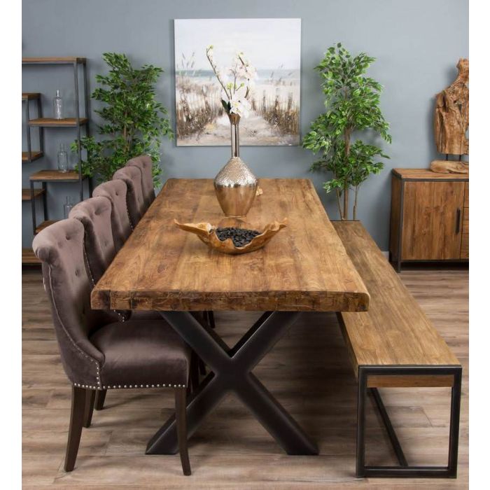 We have another member that has been added to our Urban Fusion collection and we absolutely love it! The 3m dining table has a seamlessly rustic reclaimed teak table top where the characterful grain of the timber can really be appreciated, the legs are a unique cross shape that is made from iron providing strength and durability. The Urban Fusion cross dining table has been paired with our Urban Fusion Backless Bench to provide relaxed seating meaning you can have 6 people comfortably sat on these benches which gives this dining set a versatile advantage. We have also paired this set with our plush Velveteen Ring Back dining chairs to add style and sophistication to a seamlessly rustic set, the seat has been filled with foam and sprung webbing to offer maximum comfort and support that will not sag over time and remain plump for years to come.