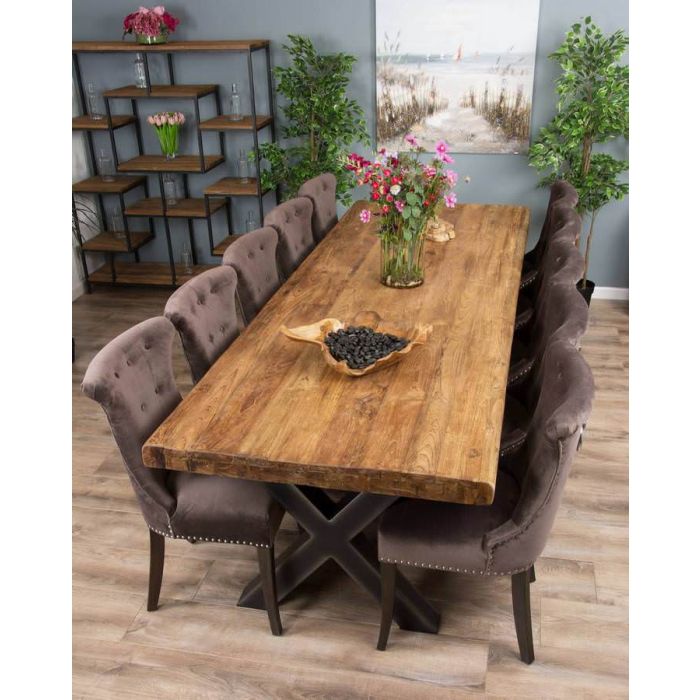 We have another member that has been added to our Urban Fusion collection and we absolutely love it! The 3m dining table has a seamlessly rustic reclaimed teak table top where the characterful grain of the timber can really be appreciated, the legs are a unique cross shape that is made from iron providing strength and durability. The Urban Fusion cross dining table has been paired with our luxurious Velveteen Ring Back dining chairs to add style and sophistication to a seamlessly rustic set, the seat has been filled with foam and sprung webbing to offer maximum comfort and support that will not sag over time and remain plump for years to come.