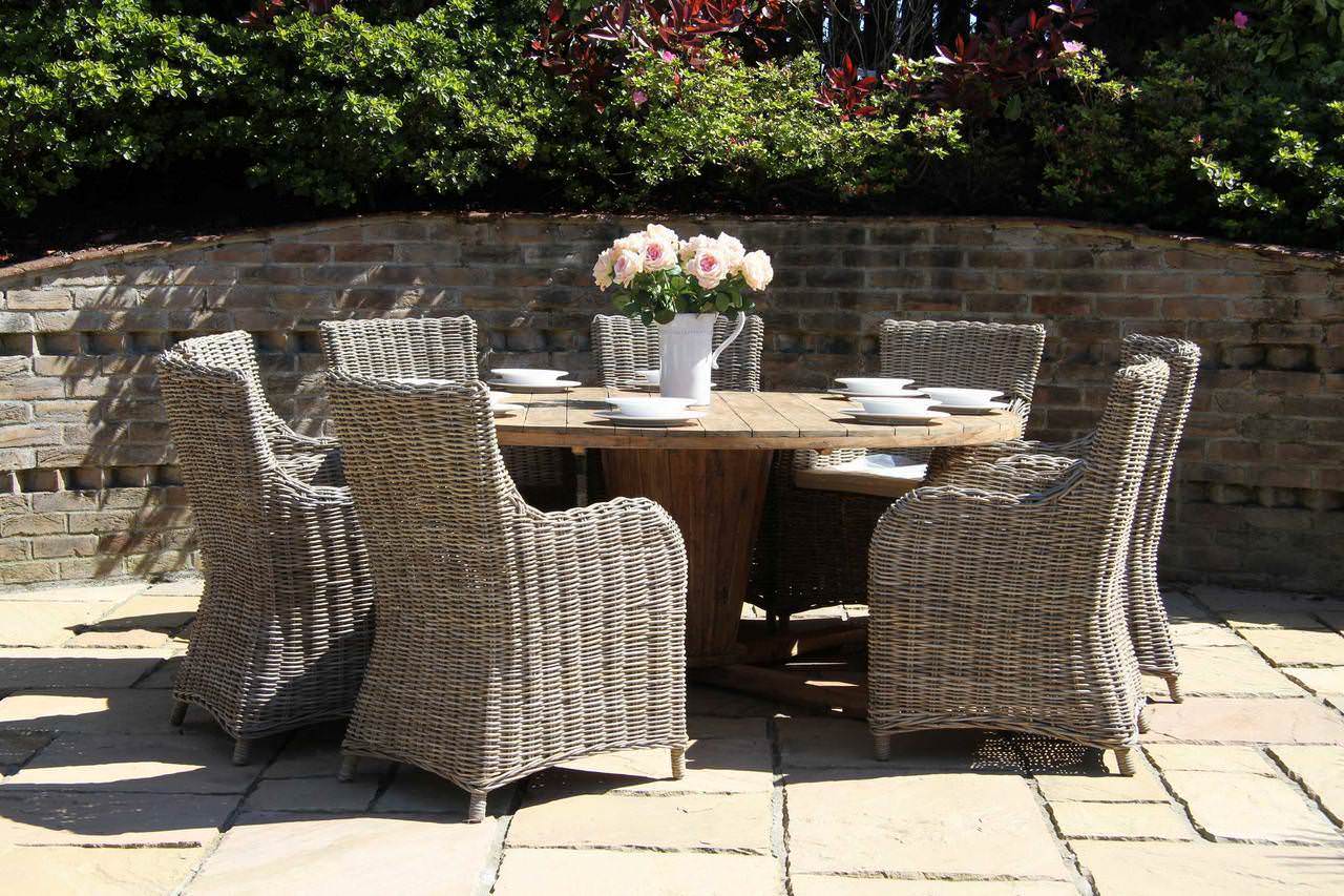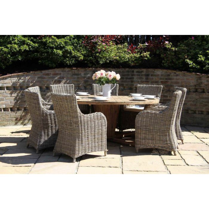To accompany this gorgeous table is six Donna natural wicker chair ideal for dining areas but especially for people who are anxious to create a completely natural 100% environmentally friendly feel to their home. These natural products are suitable for outdoor use and look beautiful with our reclaimed teak character table. They have been manufactured with a carefully crafted wooden framework and covered in an attractive natural Kubu grey wicker. Linen cushions are available in either natural or black.