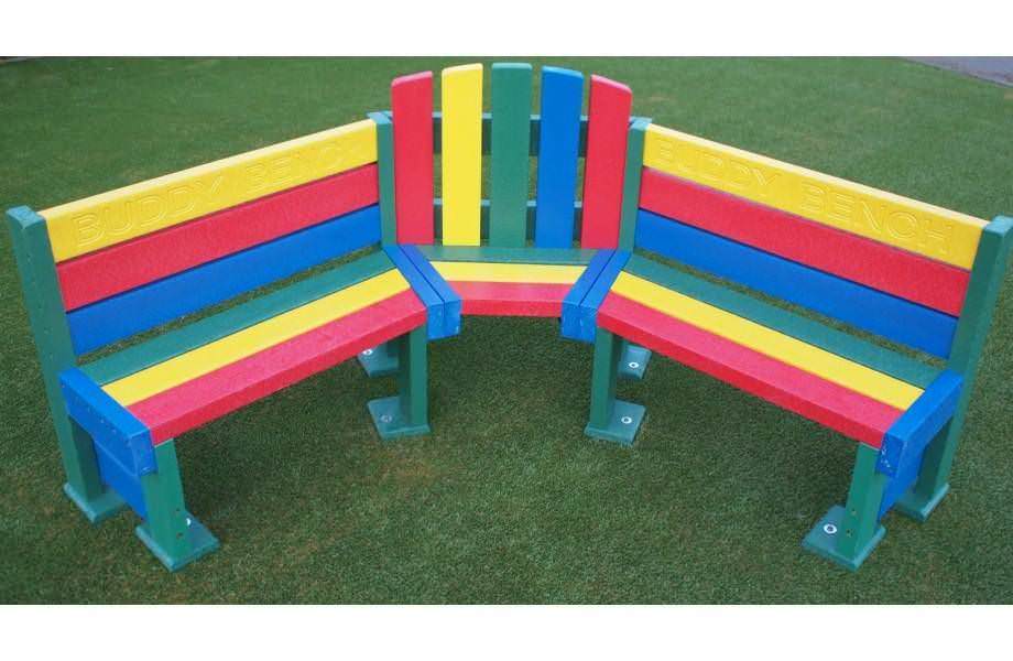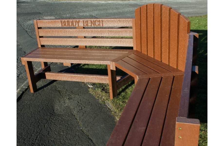 The buddy bench was designed to encourage non-verbal communications such as eye contact and positive body language for children who struggle to form relationships easily, the curved design helps with this. It also helps to enhance inclusion in schools, the challenge of inclusivity is an ongoing issue and finding a new way of bringing children together and breaking down some of the social barriers they face is the ultimate goal. Recycled plastic is fantastically durable, strong and heavy therefore making it ideal for public areas. Made from 100% recycled plastic, the product is maintenance-free, does not rot, corrode or splinter. There is no staining or varnishing required, and the product can be left outdoors all year round.
