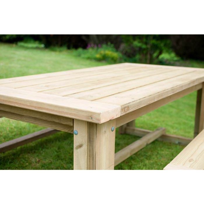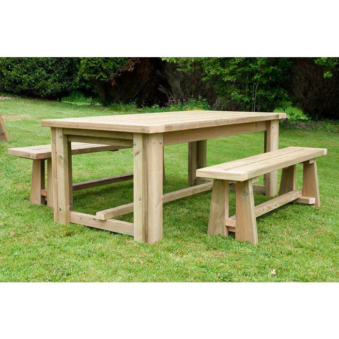 Our stunningly rustic, yet contemporary dining set is manufactured at our Sawmill in Cornwall from Swedish Redwood. The timber is tanalised, which means there is no need for any maintenance at all and it can be left outside all year round, ready for use again when the weather warms up. We think this is the perfect garden/patio set for busy family life, it is also robust enough to use commercially in pubs and restaurants and can seat 6-8 people comfortably.